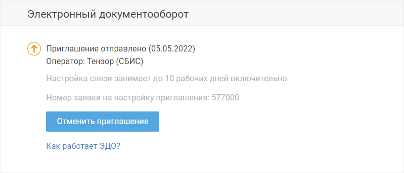 После успешной отправки приглашения в блоке «Электронный документооборот» изменится статус на «Приглашение отправлено».