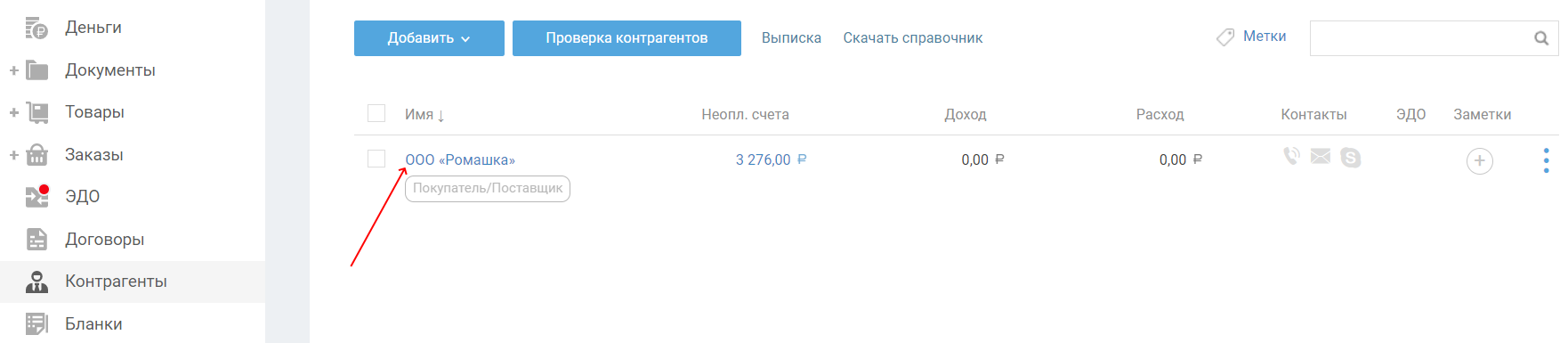 В разделе «Контрагенты» нажмите на наименование контрагента