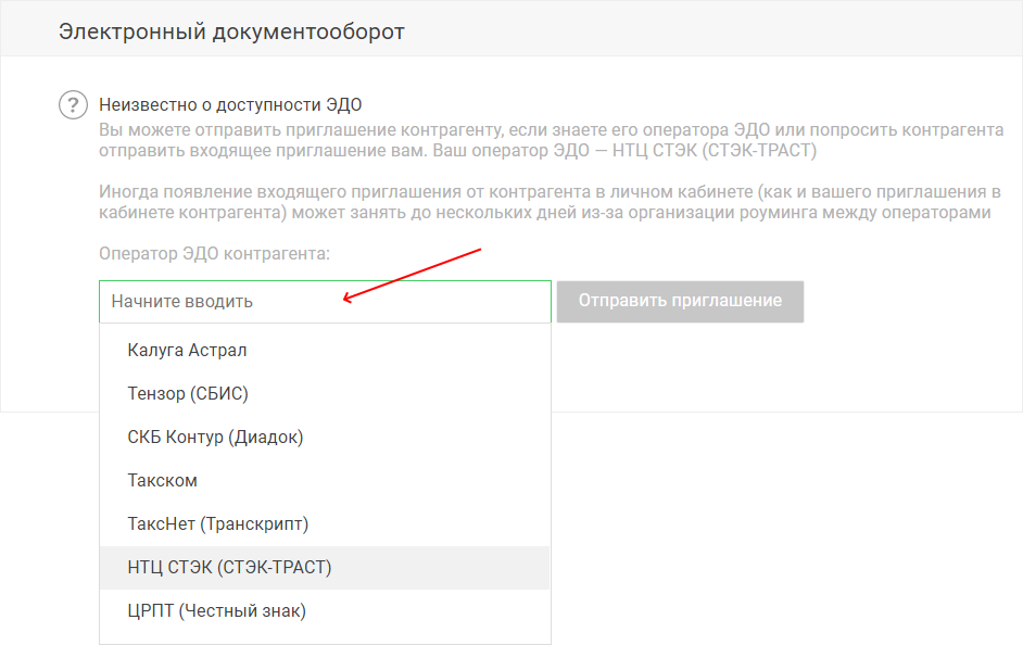 В открывшейся карточке, в блоке «Электронный документооборот», выберите оператора ЭДО, у которого обслуживается ваш контрагент, и нажмите на кнопку «Отправить приглашение»