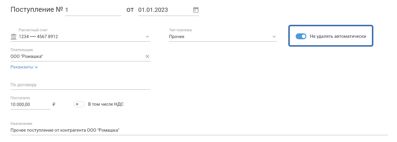 Если у вас включена интеграция с банком, то обязательно включите настройку «Не удалять автоматически» для операций по расчётному счёту. Она необходима, чтобы автосверка баланса по расчётному счёту не удалила данную операции из вашего личного кабинета.