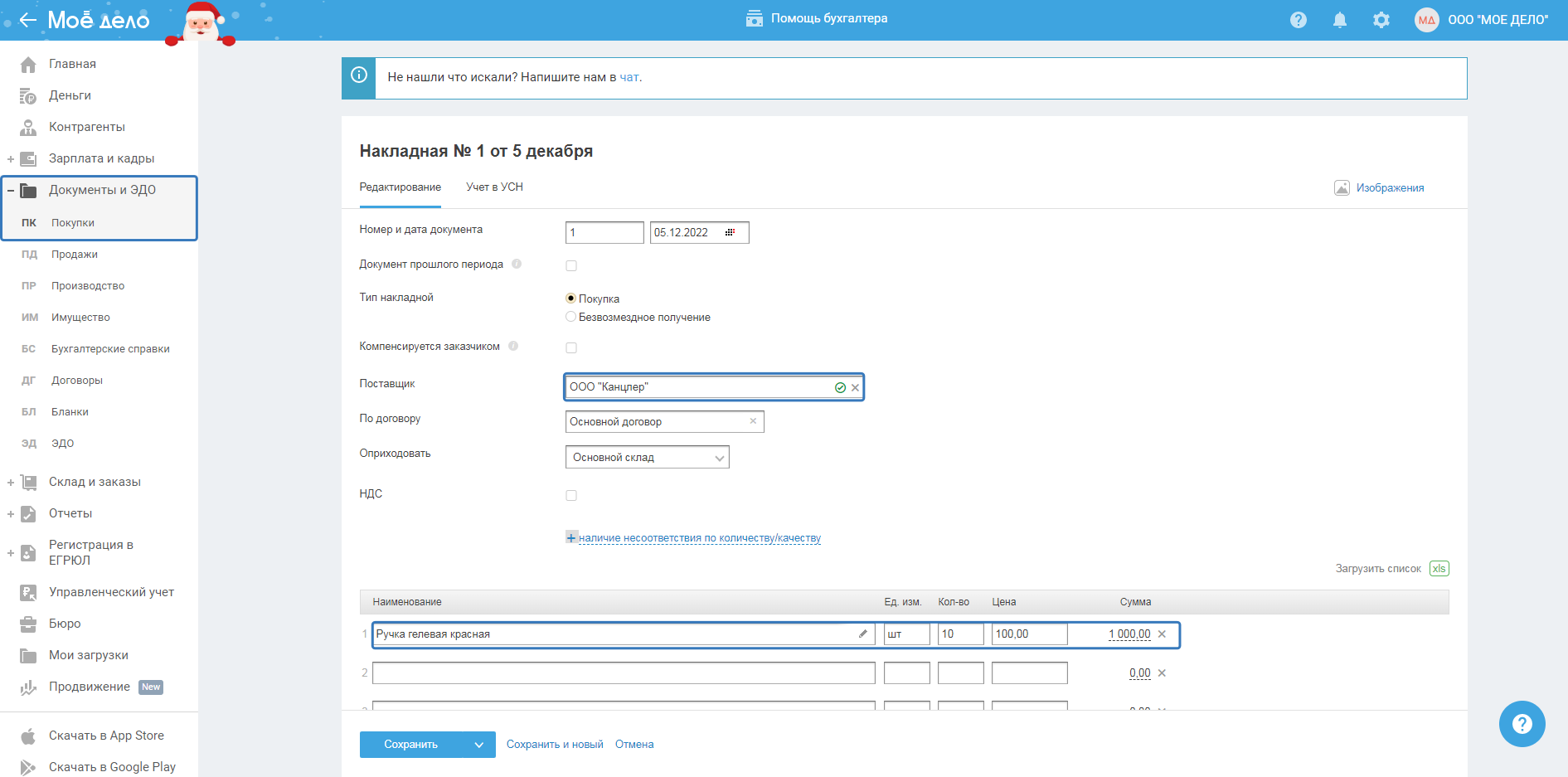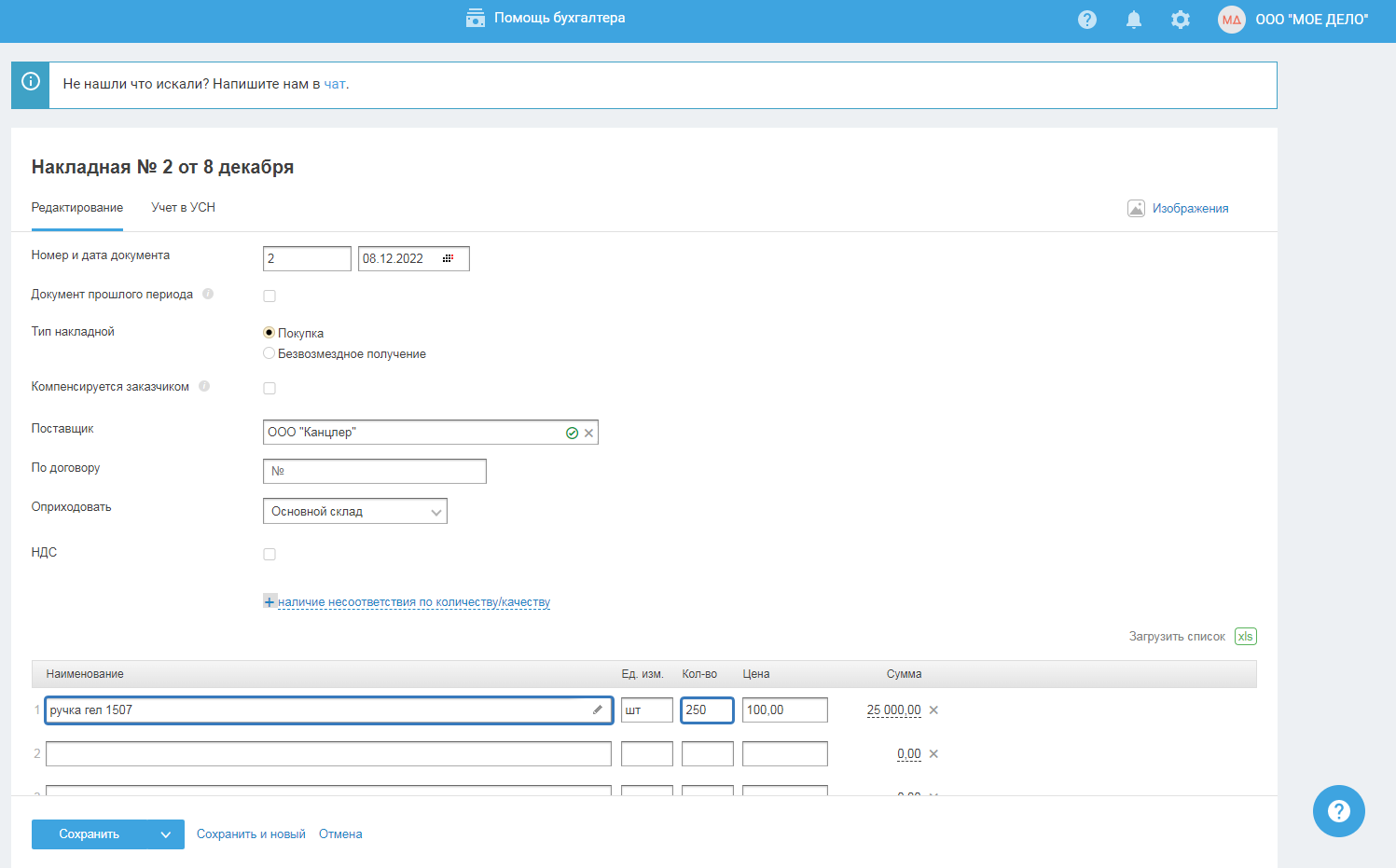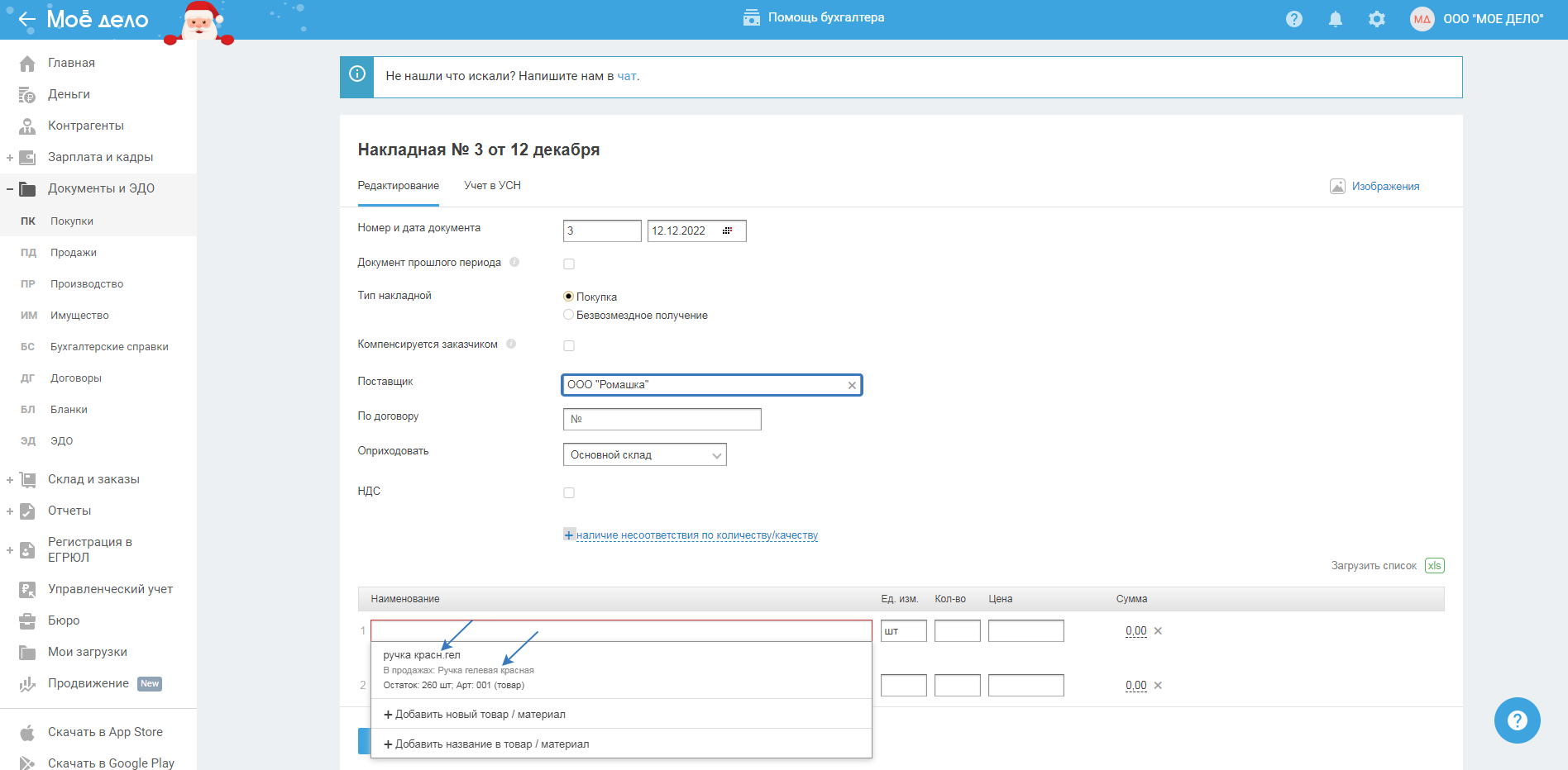 в поле "Выберите существующий товар" укажите ранее созданное в сервисе наименование товара/материала - это название под которым товар будет оприходован на склад и в дальнейшем будет указываться в документах на продажу выставленных клиентам. Выберите наименование товара/материала из выпадающего списка или начните печатать название на клавиатуре. В рассматриваемом примере название существующего товара "Ручка гелевая красная". Поле того как заполните все поля, нажмите кнопку Добавить и сохраните документ (накладная, счет-фактура, УПД):