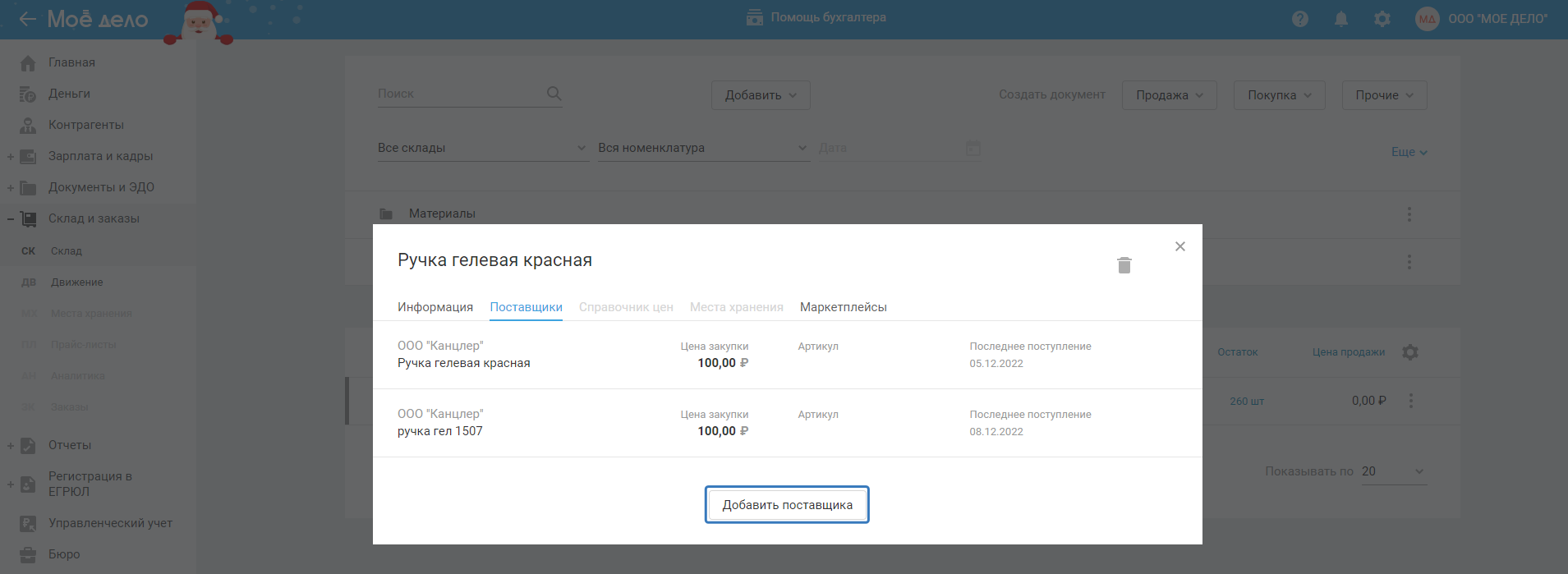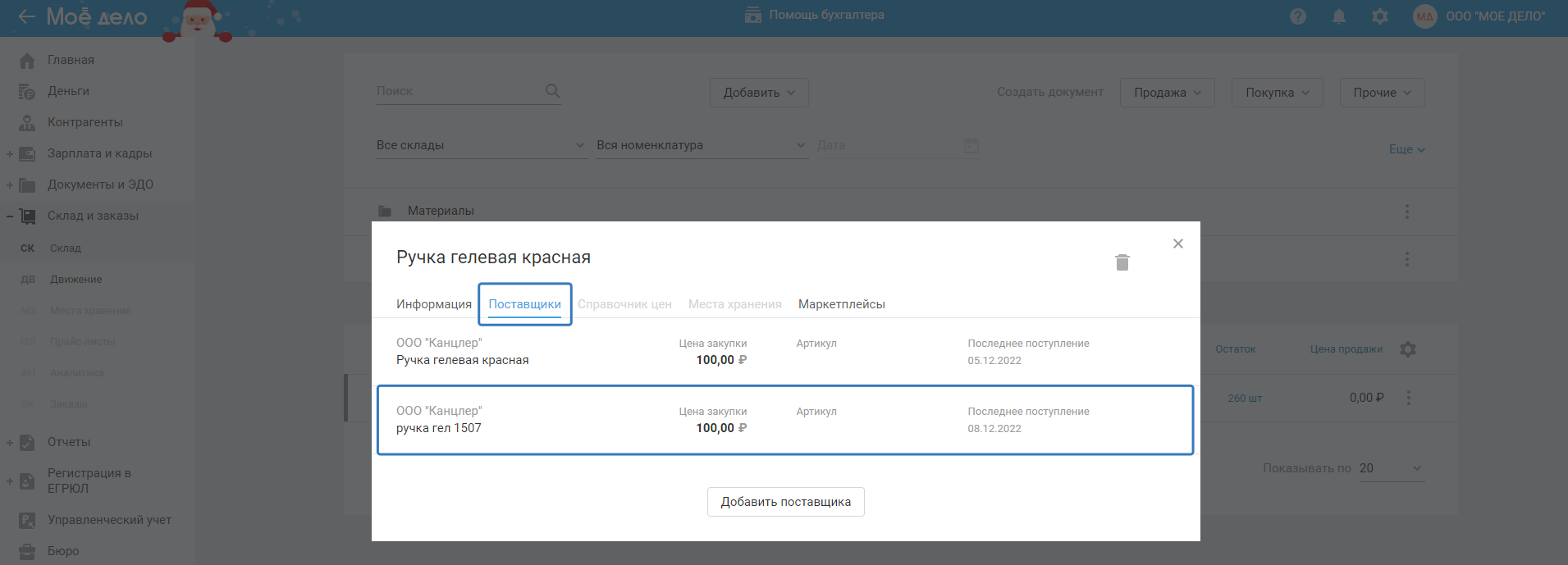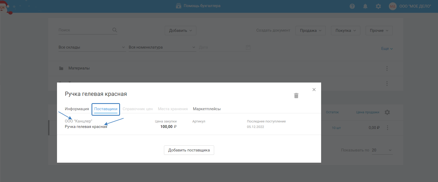 Рассмотрим на примере как это работает. От поставщика ООО "Канцлер" по накладной получен товар под названием "Ручка гелевая красная" в количестве 10 шт. и этот товар оприходован на склад. В разделе Товары - Склад при нажатии на наименование товара открывается карта товара, в которой во вкладке "Поставщики" указаны название товара и поставщик.