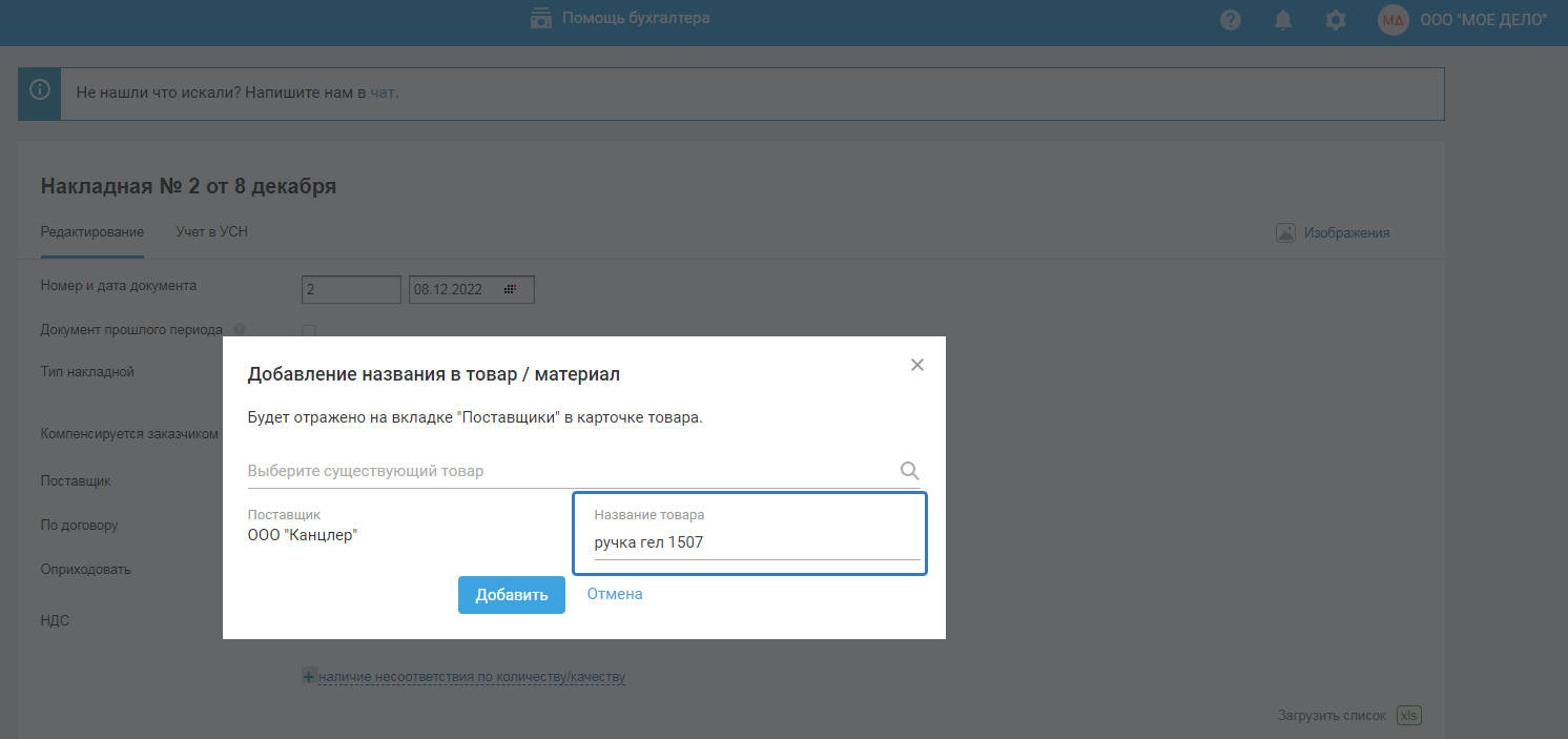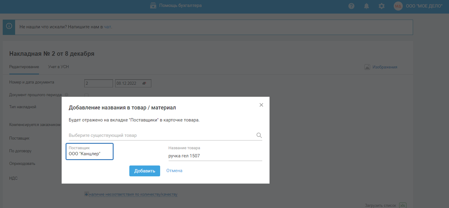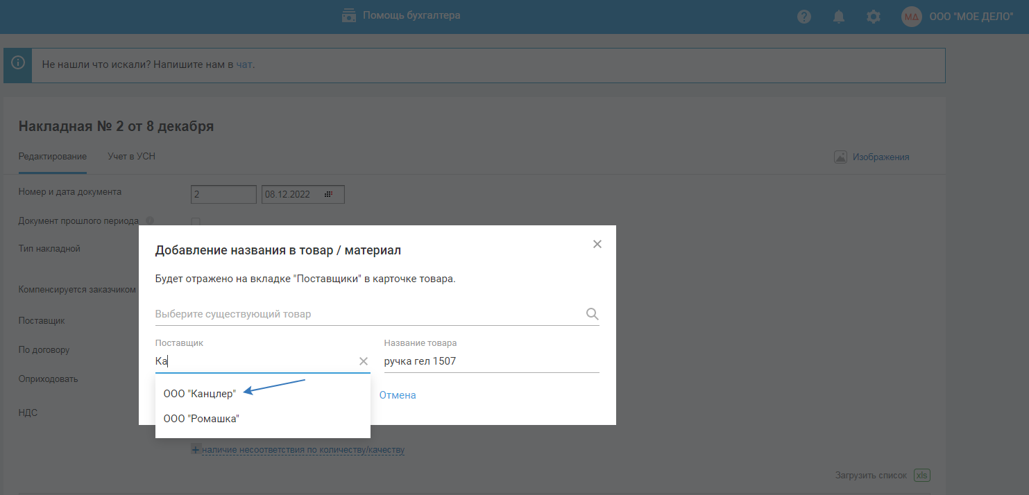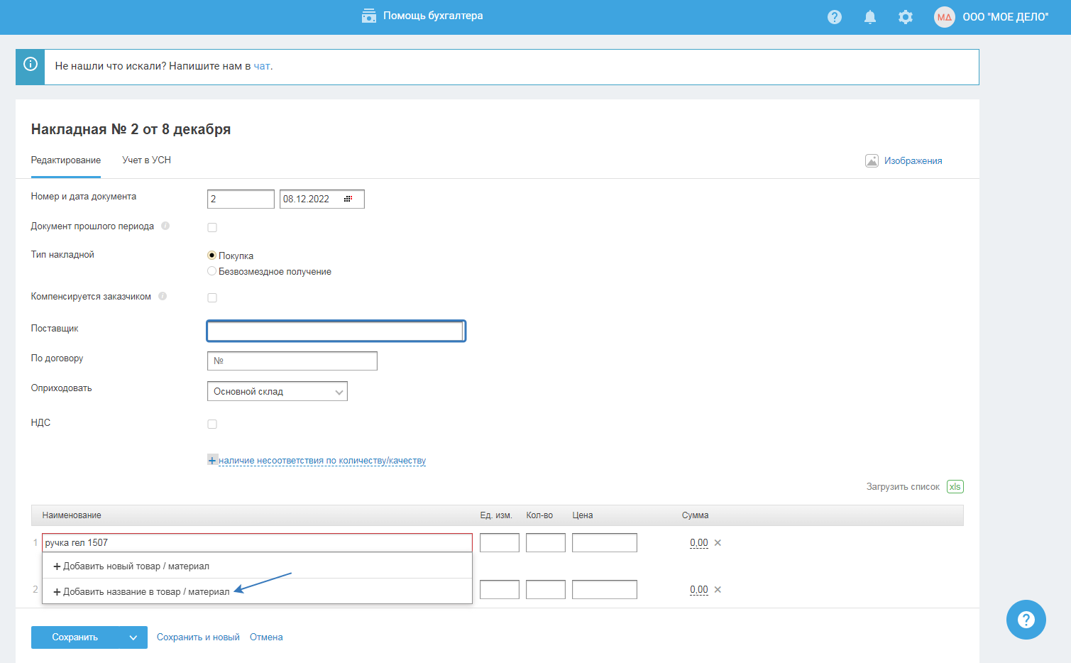 2) если в форме заполняемого документа (накладная, счет-фактура, УПД) поставщик не указан, в карточке добавления названия в товар / материал, выберите его из выпадающего списка, либо, для выбора, начните печатать наименование.