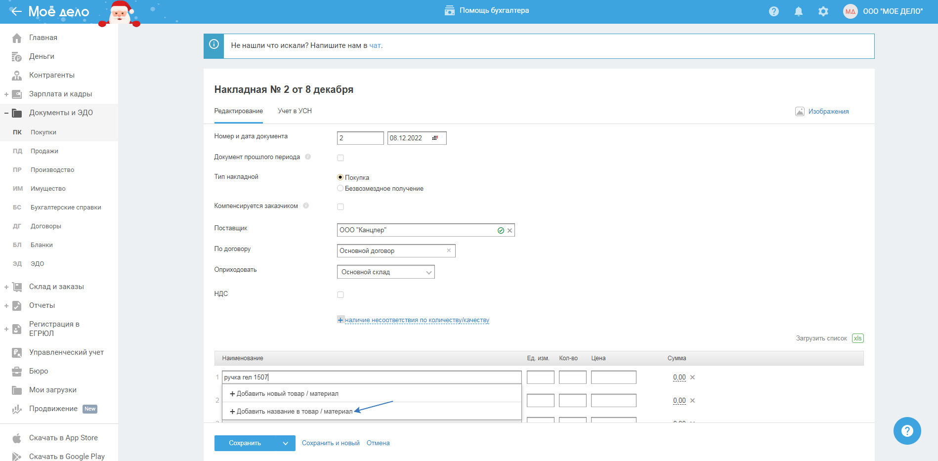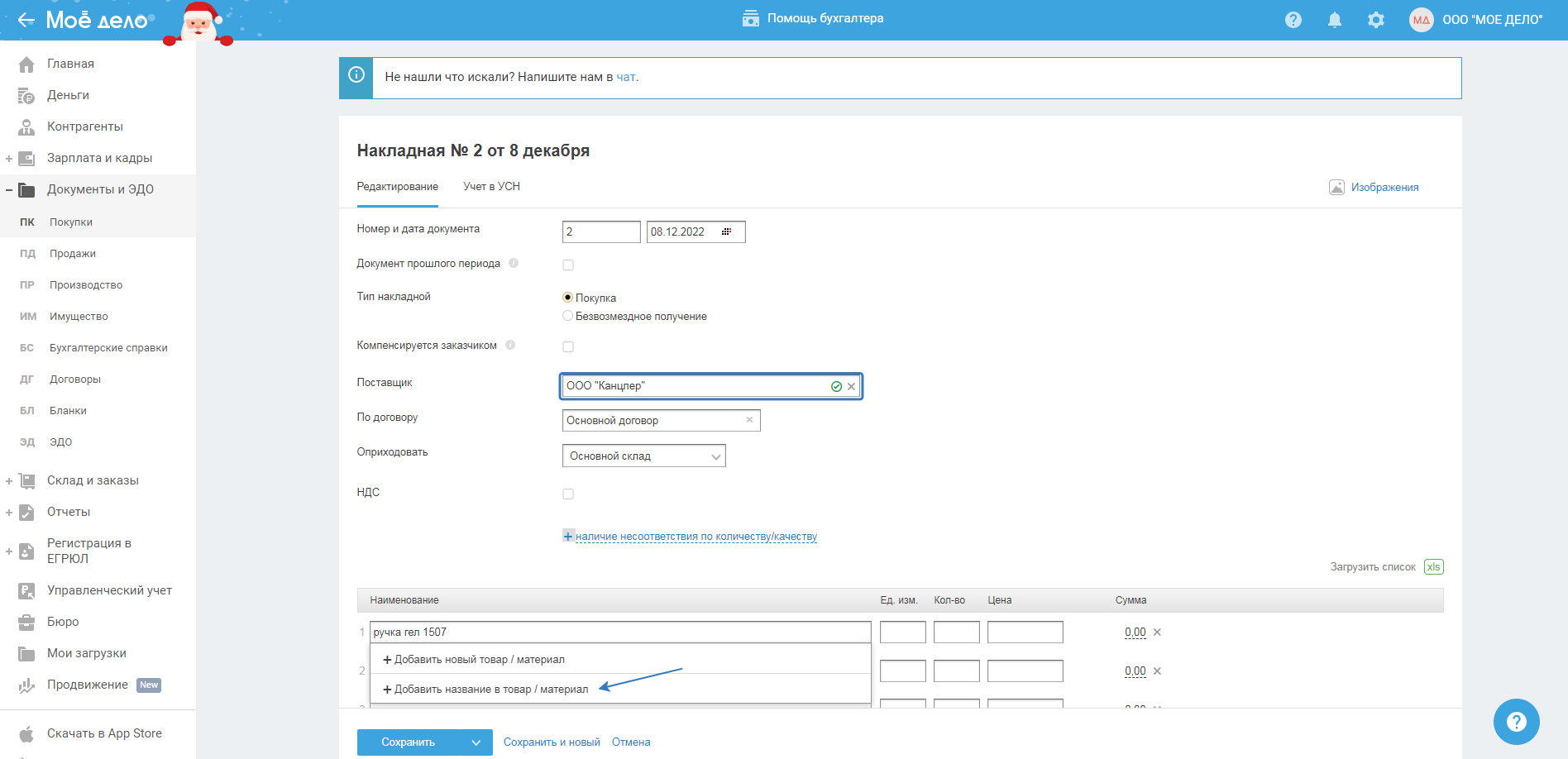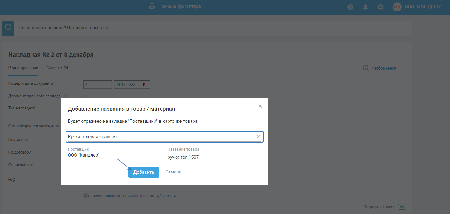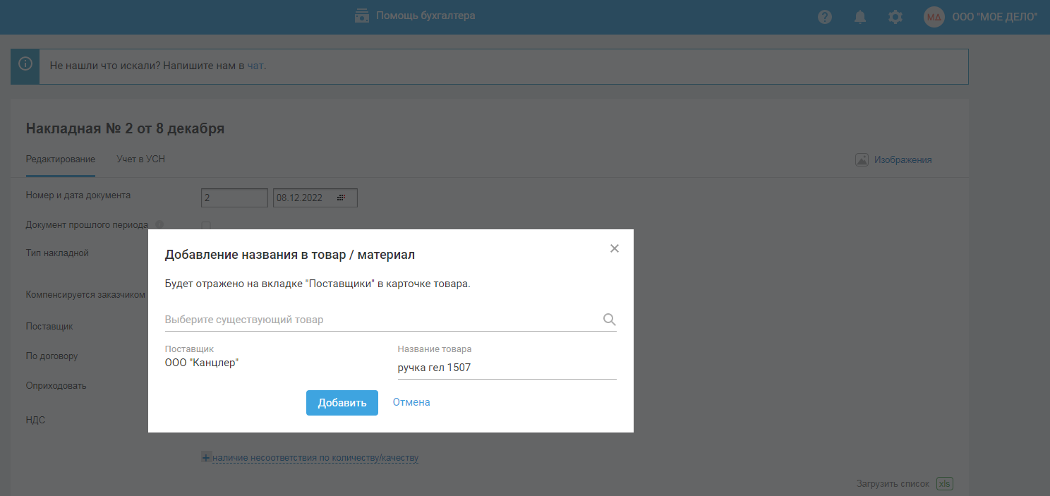 2) если в форме заполняемого документа (накладная, счет-фактура, УПД) поставщик не указан, в карточке добавления названия в товар / материал, выберите его из выпадающего списка, либо, для выбора, начните печатать наименование.