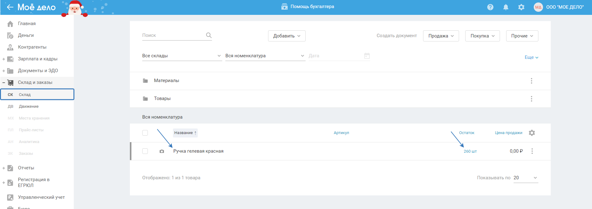 в итоге на складе будет учитываться товар "Ручка гелевая красная" в количестве 260 шт и при нажатии на наименование товара: