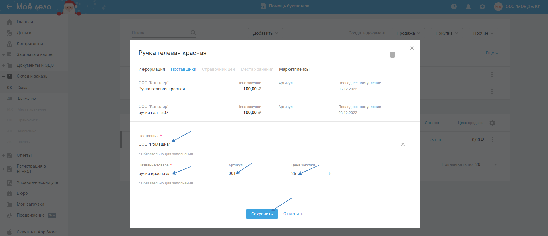 Заполните обязательные поля "Поставщик" и "Название товара" и при необходимости поля "Артикул" и "Цена закупки"(для автоматического заполнения цены за единицу в документах на покупку) и сохраните.