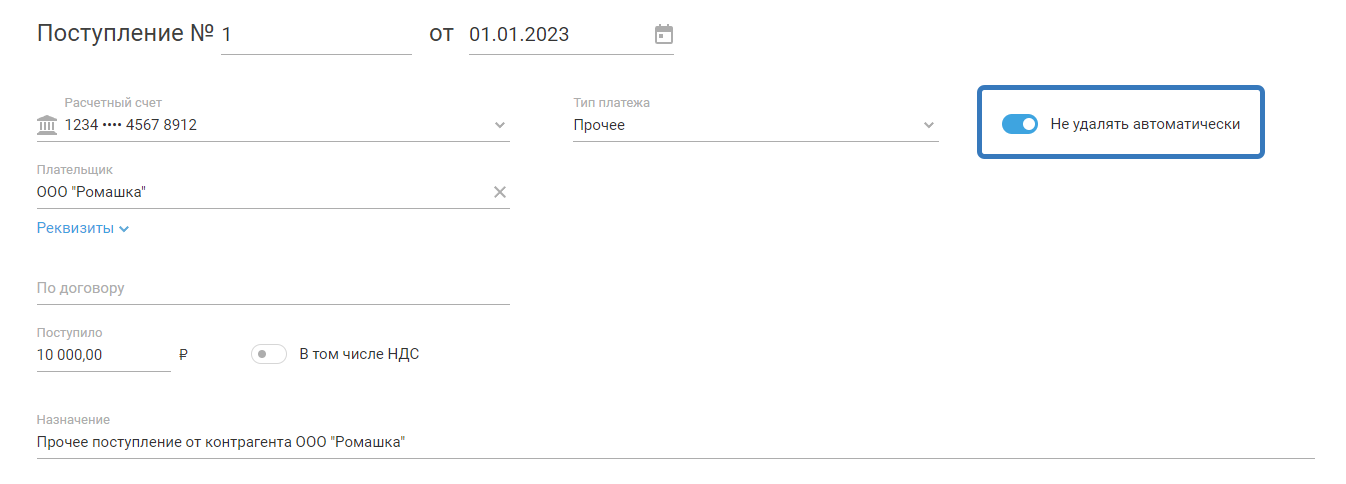 Если у вас включена интеграция с банком, то обязательно включите настройку «не удалять автоматически» для операций по расчётному счёту. Она необходима, чтобы автосверка баланса по расчётному счёту не удалила данную операции из вашего личного кабинета.