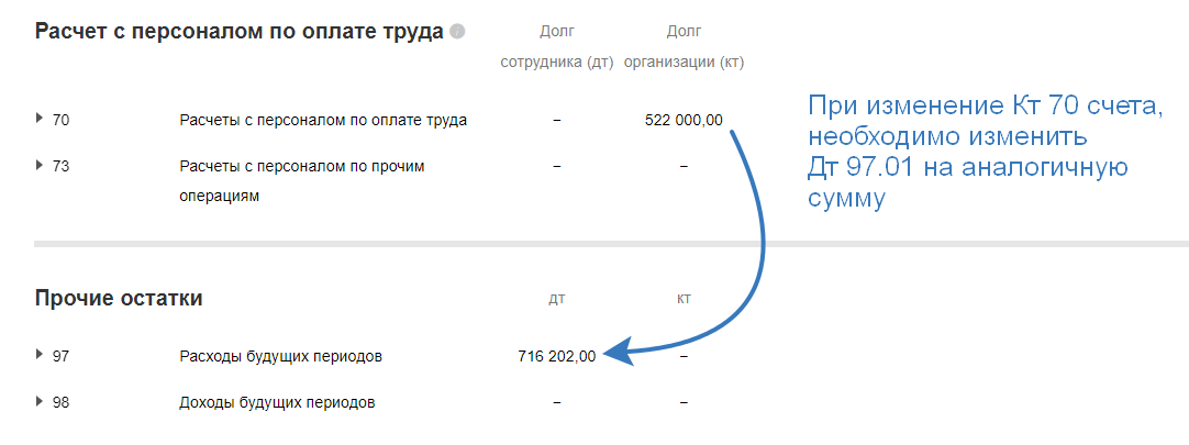 Остаток на счетах 70.01 и 76.09 уменьшается или увеличивается вместе со счётом 97.01 и 98.01. Т.е. при изменении остатка на 70 счёте, необходимо изменить остаток на 97 или 98 на аналогичную сумму. Это необходимо для того, чтобы после исправления остатка дебет и кредит были равны.