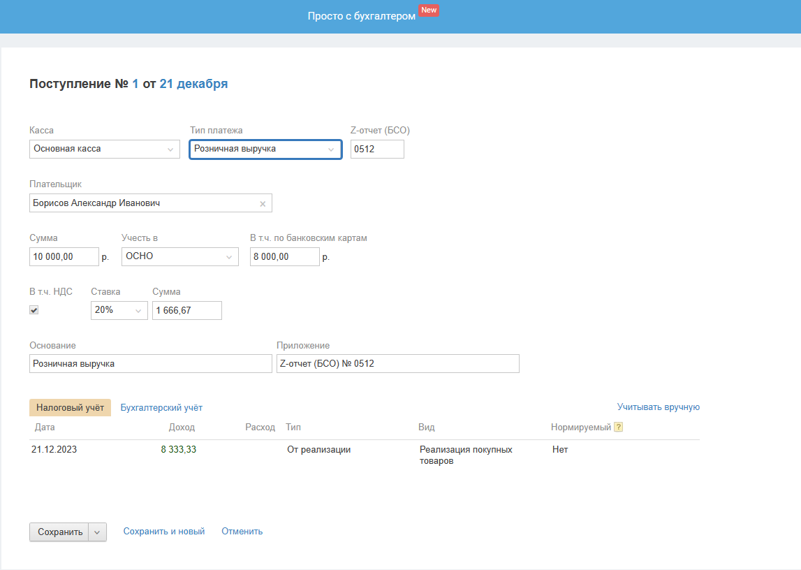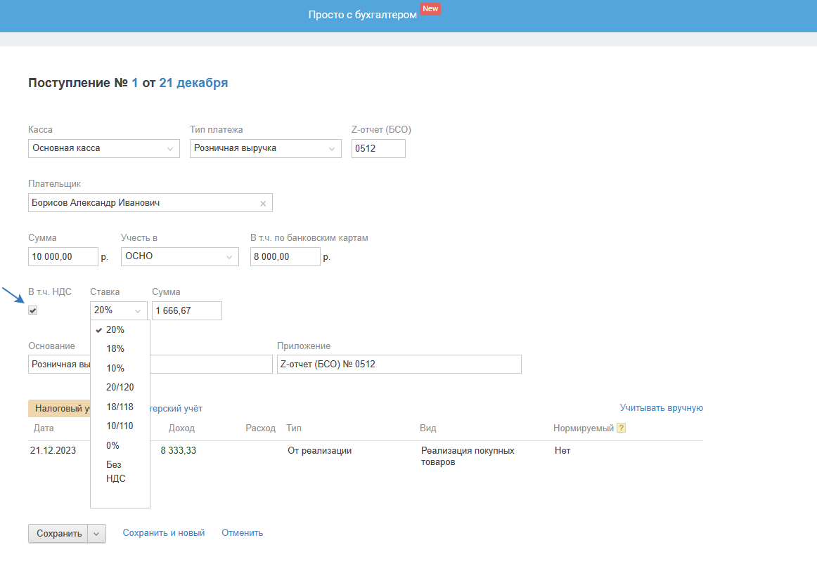В поле «Учесть в» — поле доступно при совмещении УСН+ПСН или ОСНО+ПСН. Выберите тот режим, к которому относится выручка. Например, выручка получена в магазине на ПСН, в поле необходимо выбрать режим ПСН. Если часть денег по одной системе налогообложения, а часть – по другой, то нужно создать две отдельные операции с типом «Розничная выручка», где в каждой выбрать свой режим.