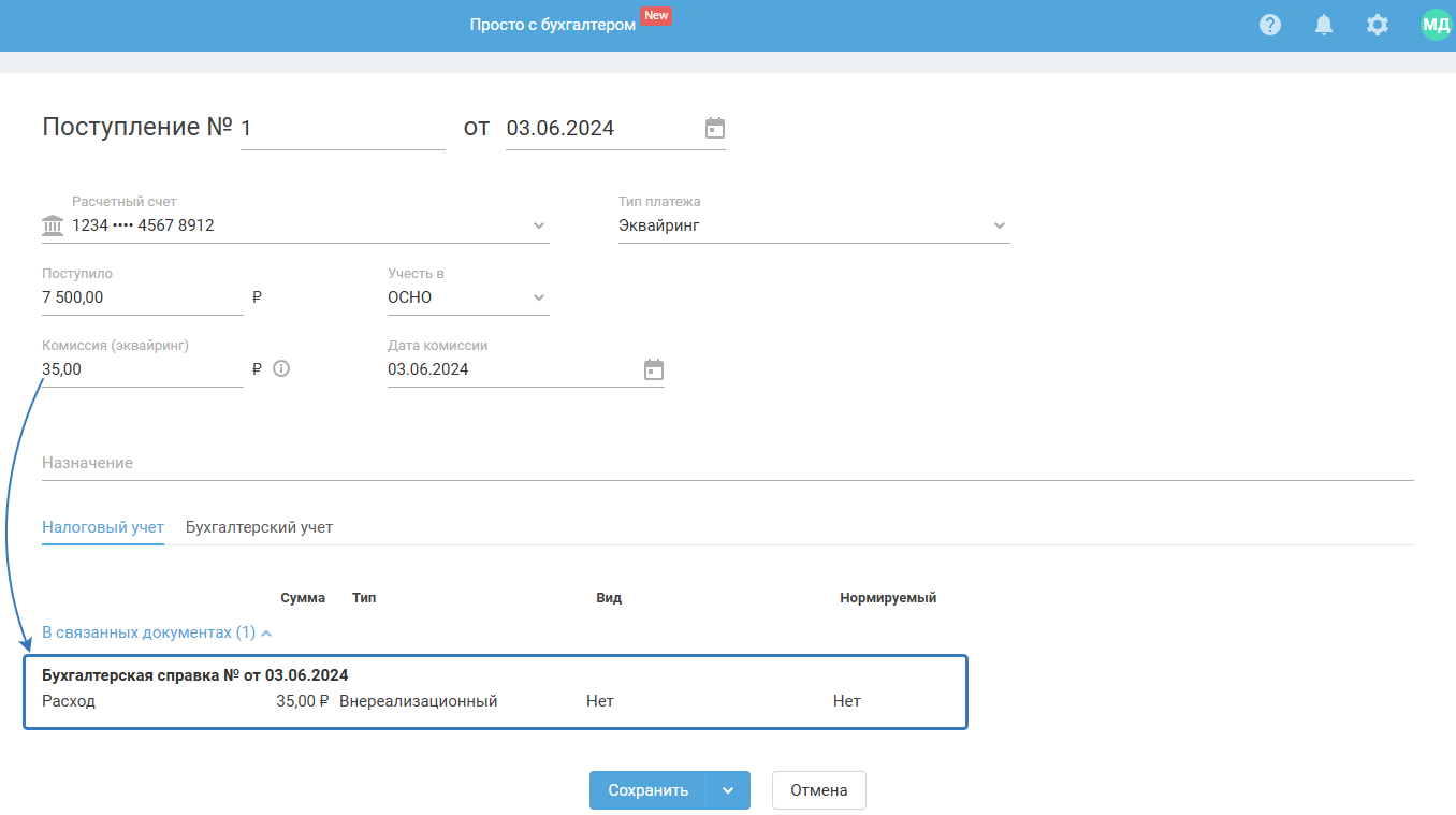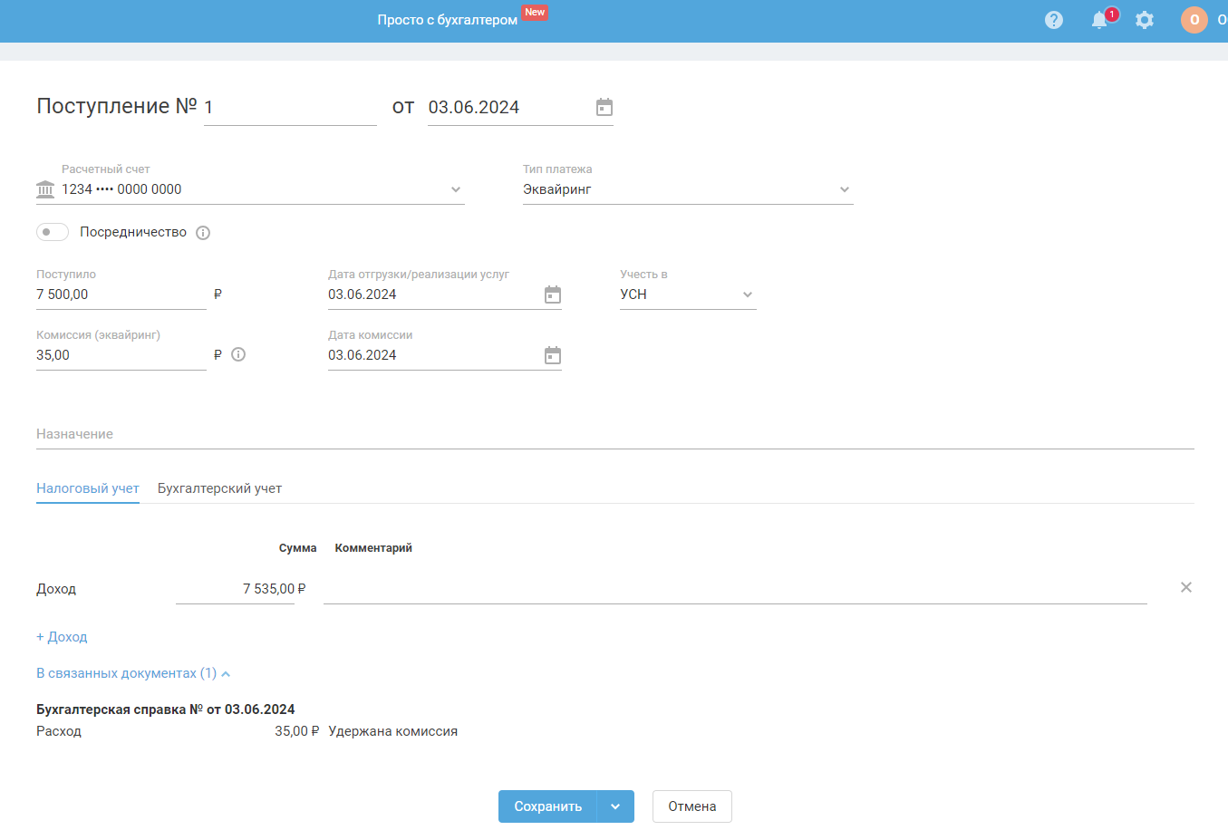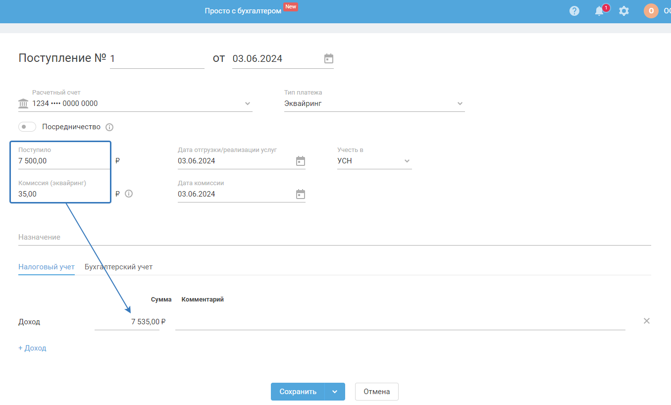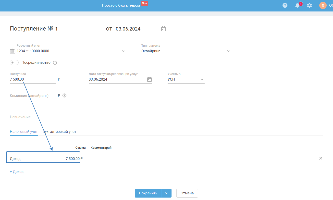 Если значение в поле «Комиссия (эквайринг)» не будет заполнено, то сумма дохода будет равна значению в поле «Поступило»: