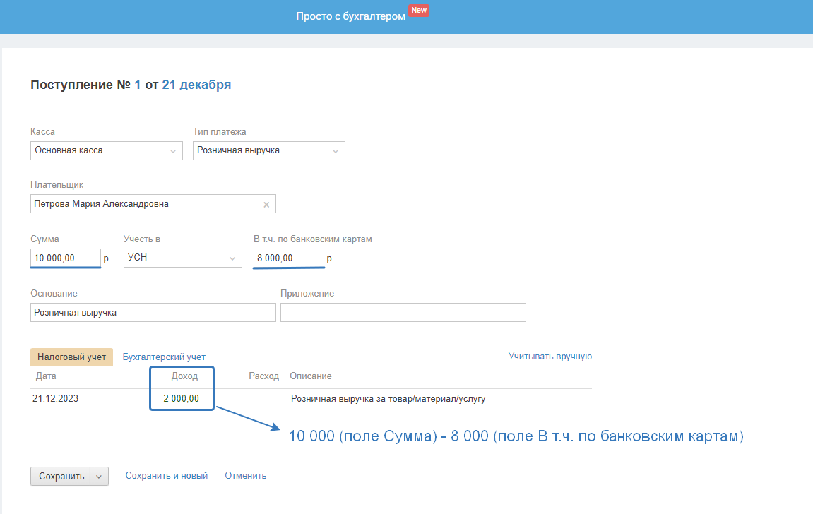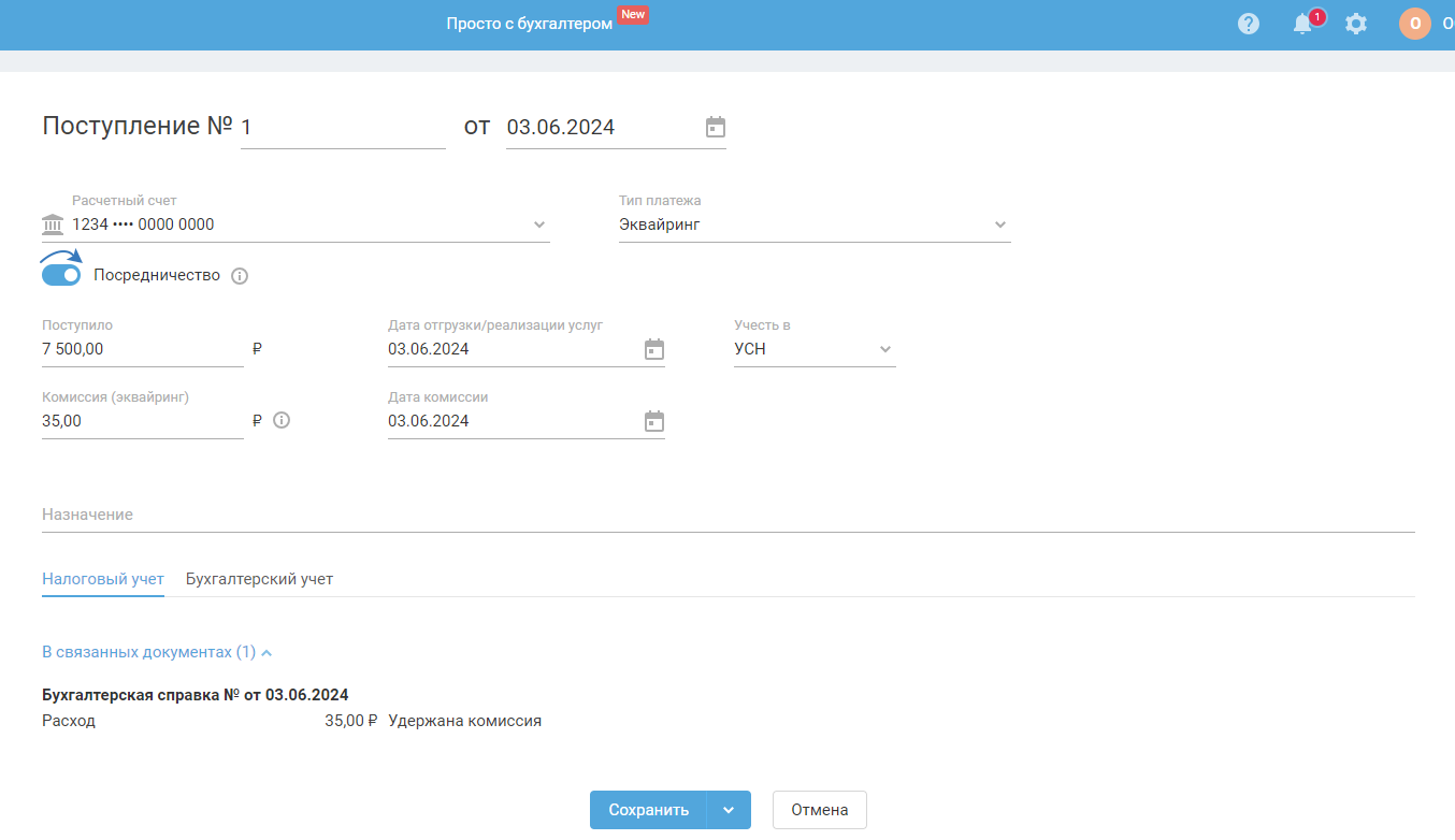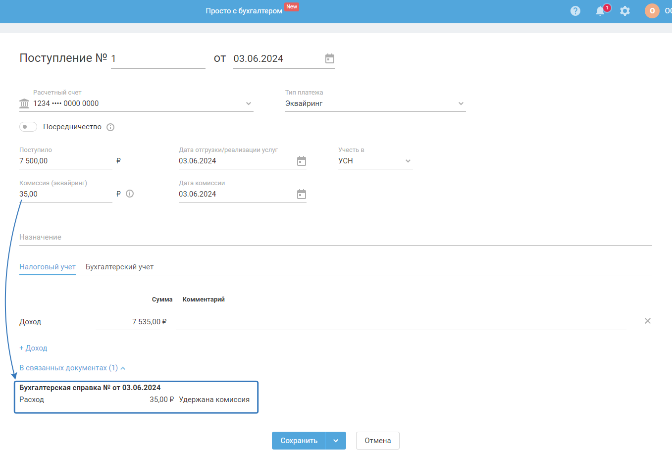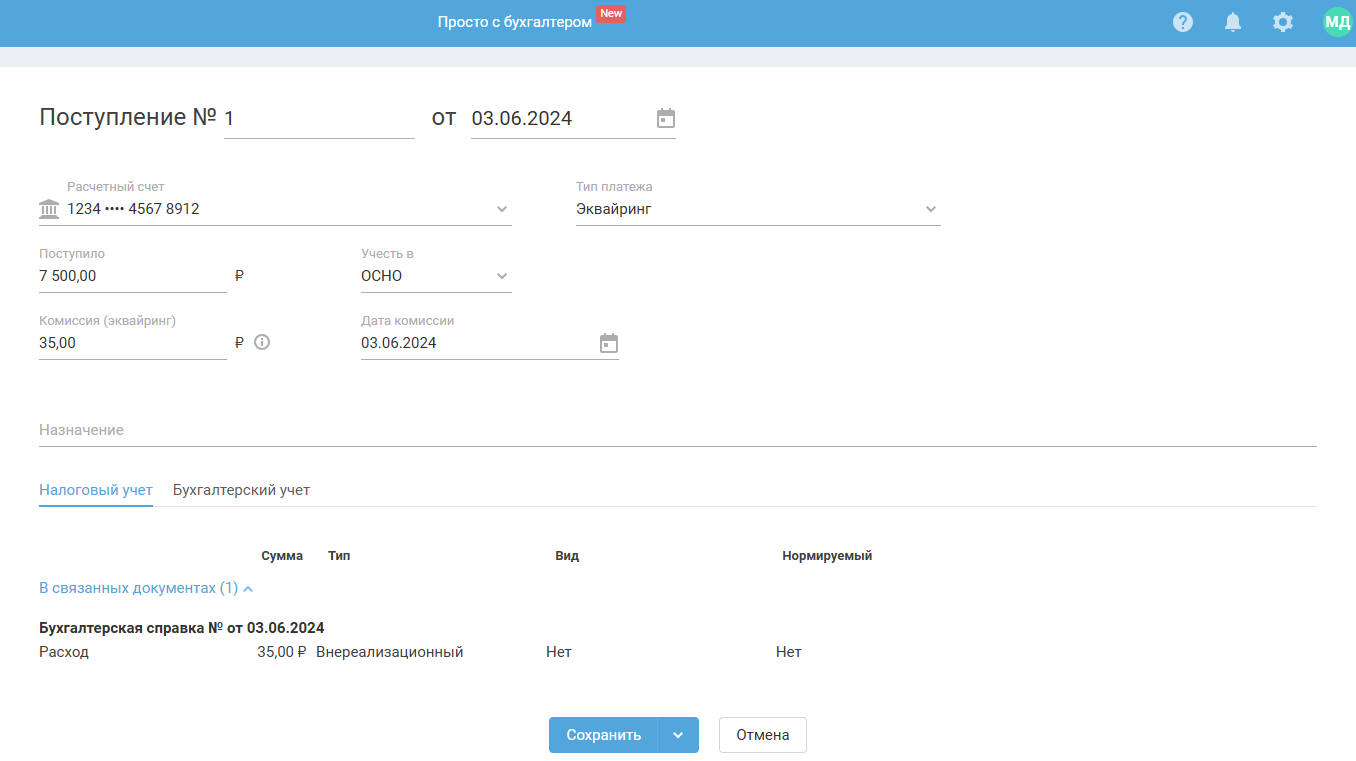 Если значение в поле «Комиссия (эквайринг)» не будет заполнено, то сумма дохода будет равна значению в поле «Поступило»: