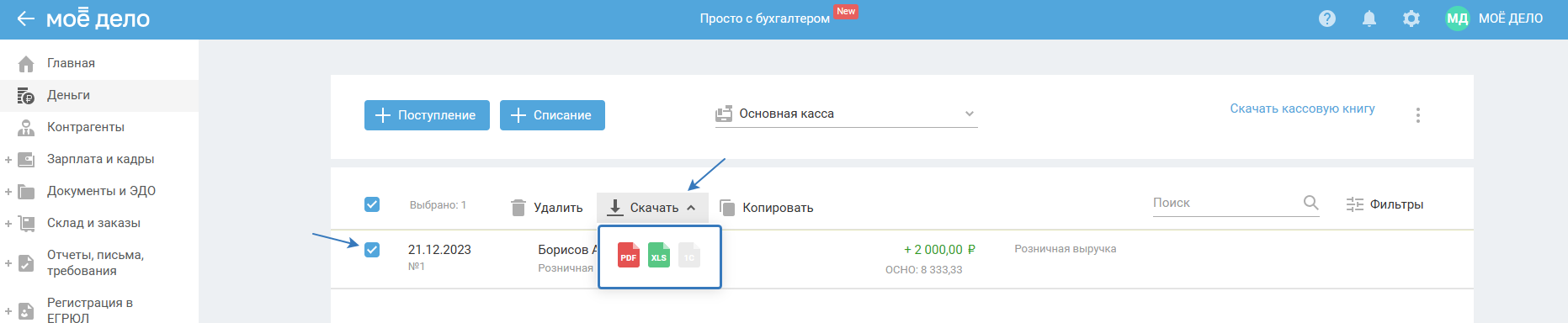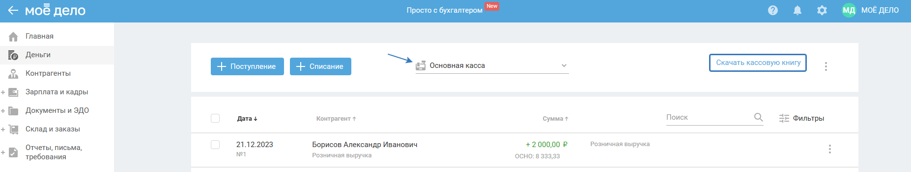 Выберите одну из касс (по умолчанию используется «Основная касса»), созданных в разделе «Реквизиты» в разделе «Деньги», нажмите на кнопку «Поступление»: