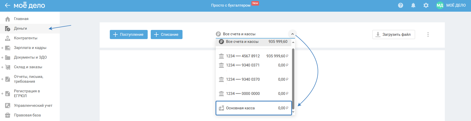 Выберите расчётный счёт в разделе «Деньги», нажмите «Поступление»: