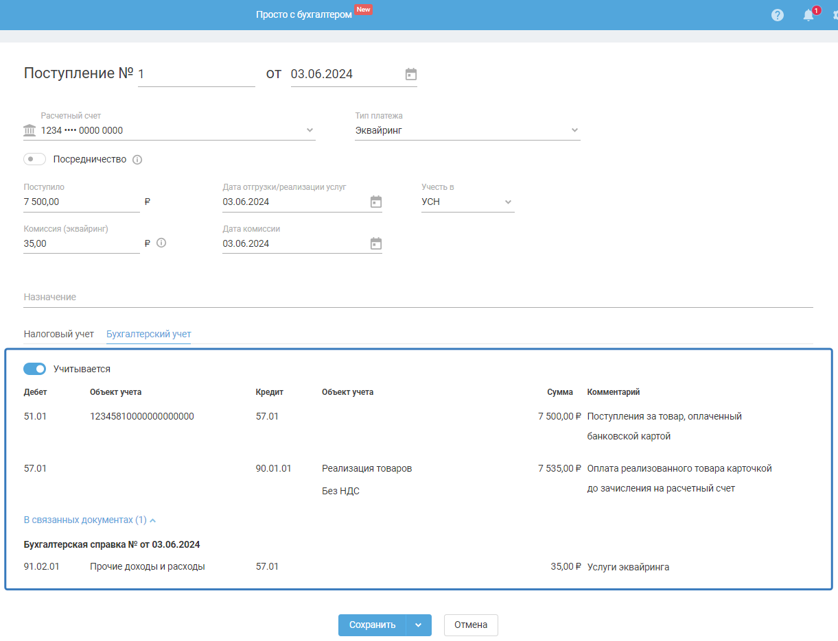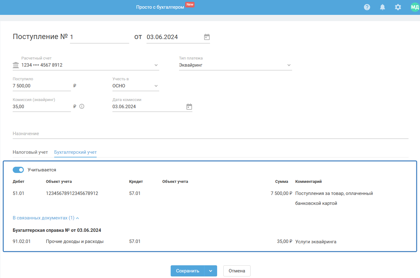 Эквайринг (Поступление за товар, оплаченный банковской картой)