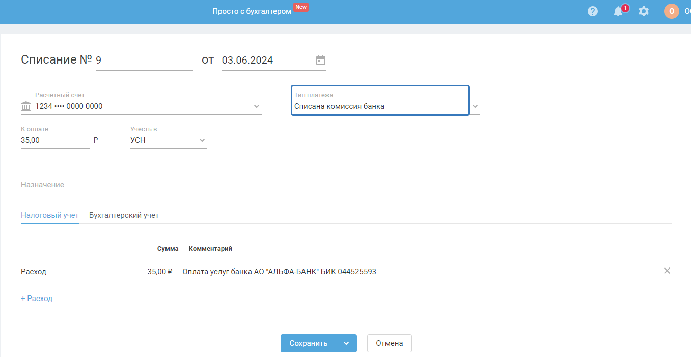 Если комиссия за эквайринг удерживается после поступления денег на р/сч, то в сервисе она отражается через операцию «Деньги — Все счета и кассы — выберите р/сч — Списание — Списана комиссия банка» на основании выписки по р/сч: