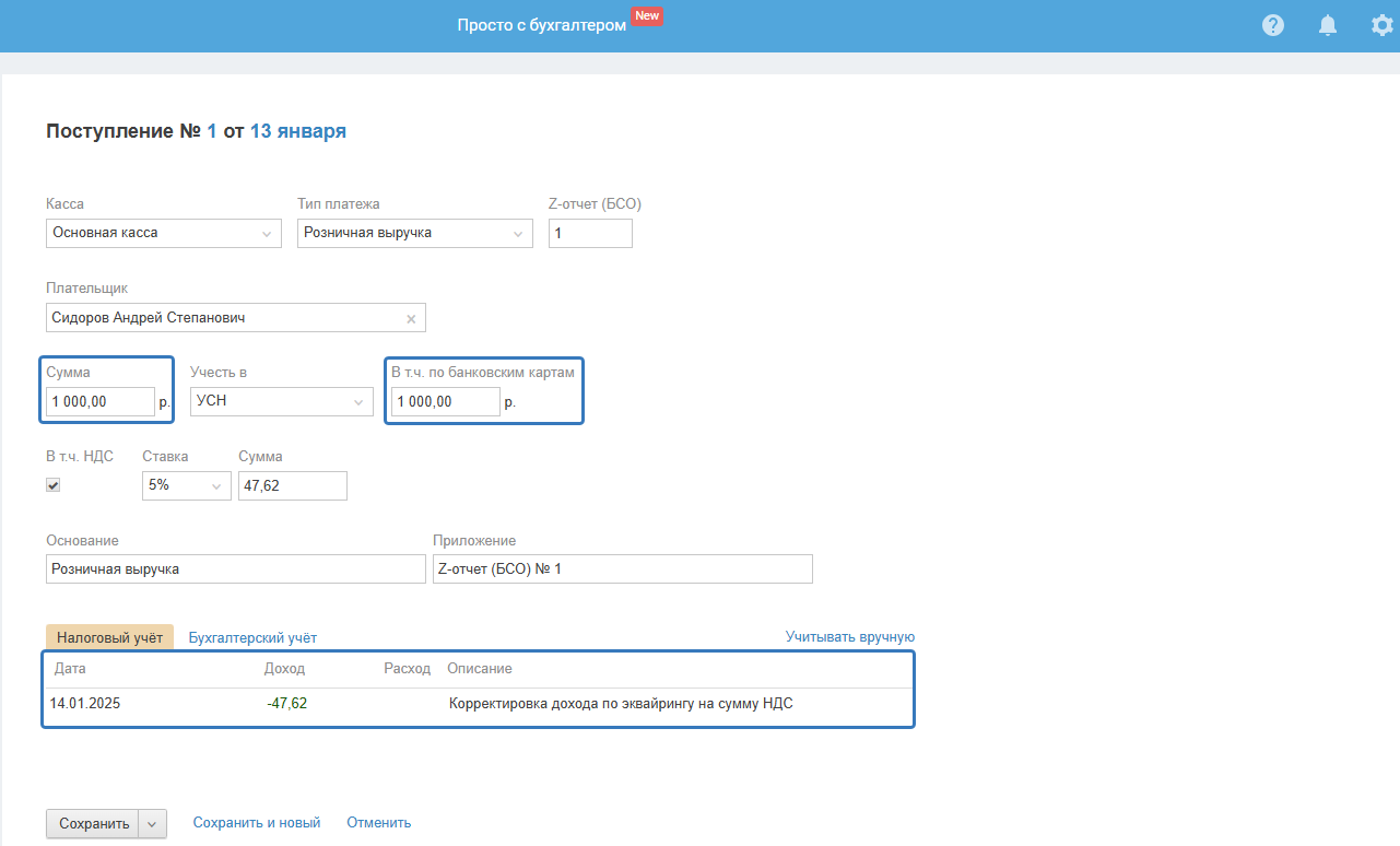 По дате Z-отчёта в разделе «Деньги» необходимо создать поступление по конкретной кассе с типом «Розничная выручка».