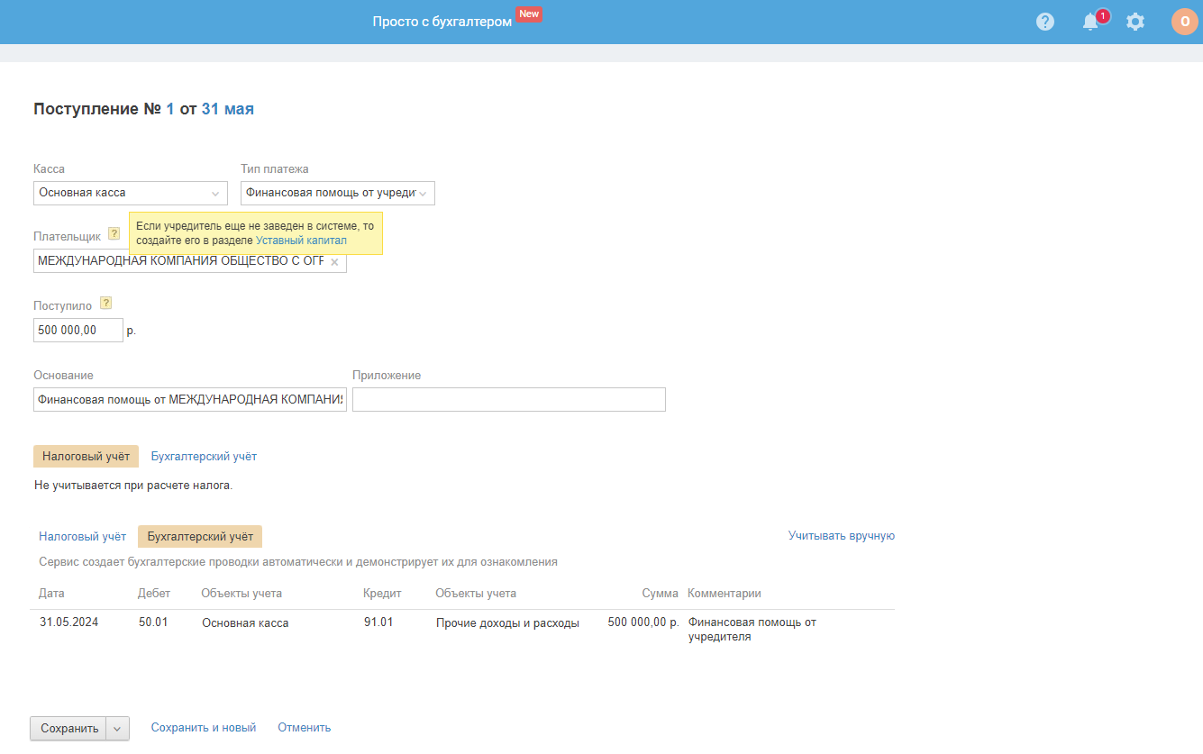Если в течение какого-то периода времени в компании произошла смена учредителя, при этом сумма уставного капитала осталась та же самая, то прежде чем отразить в сервисе финансовую помощь от учредителя, необходимо зафиксировать смену учредителя бухгалтерской справкой (подробнее).