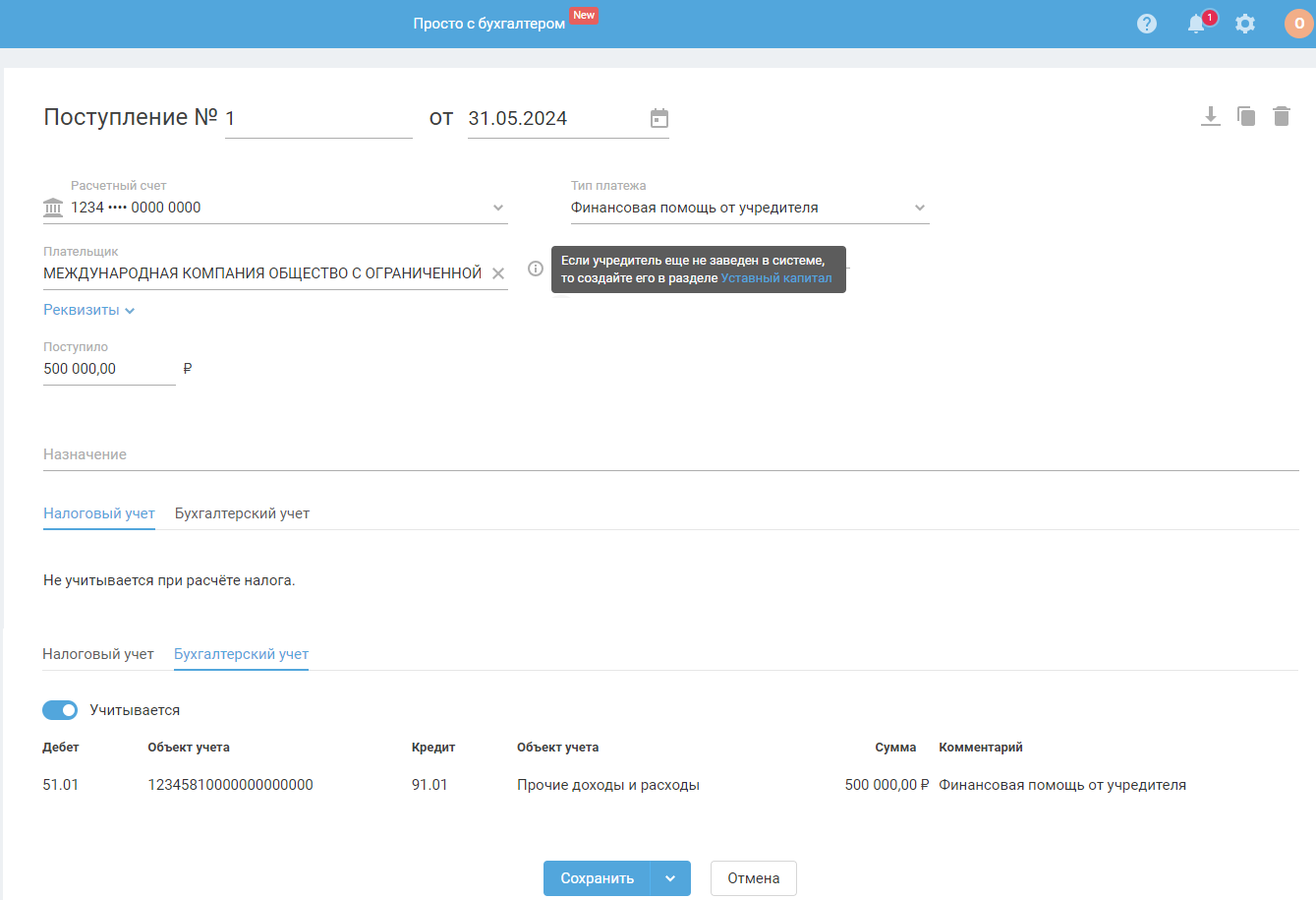 Обратите внимание. Отличие финансовой помощи от займа учредителя в том, что если у учредителя, который дает финансовую помощь, доля в уставном капитале менее 50%, то организация обязана уплатить УСН с суммы поступлений. В сервисе этот момент предусмотрен в автоматическом режиме.