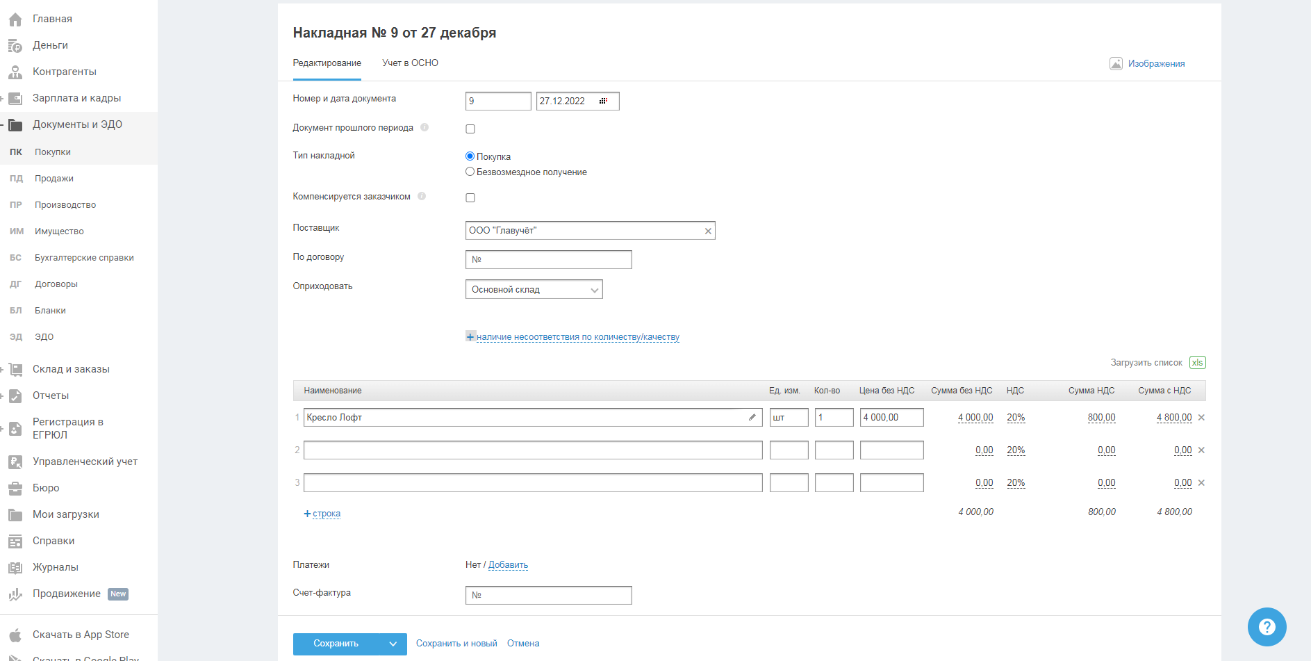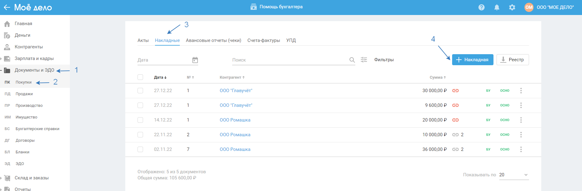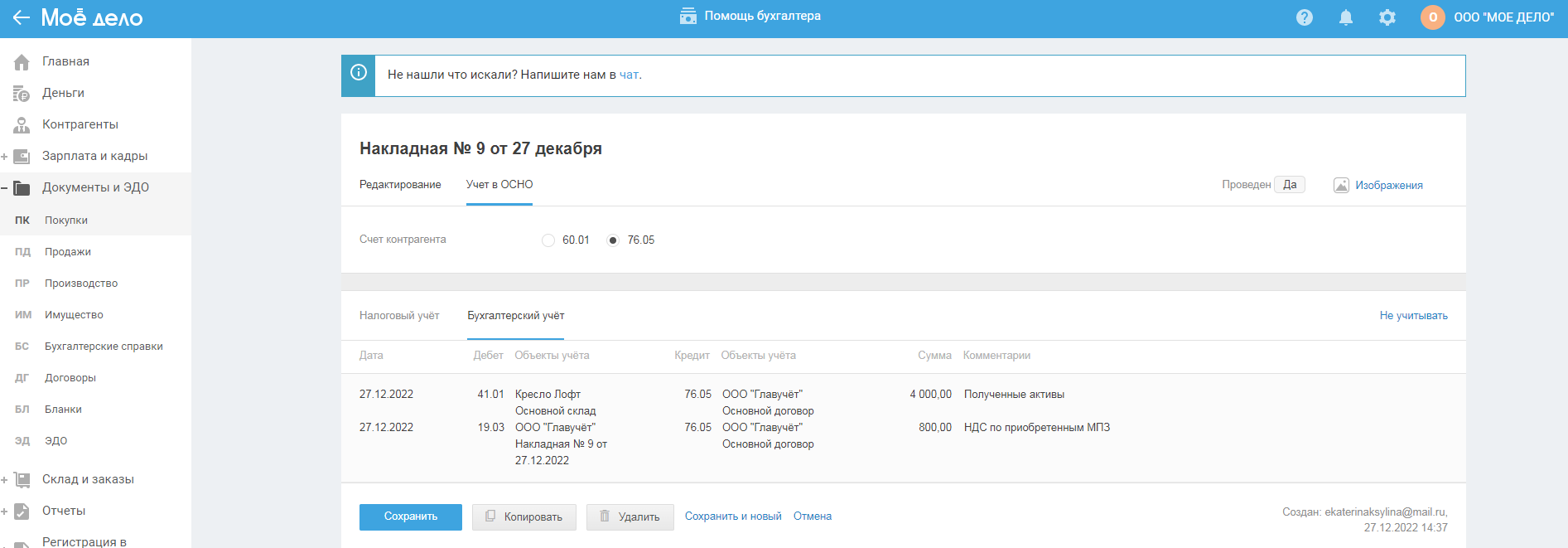 В разделе «Документы и ЭДО» — «Покупки» необходимо создать обычную Накладную на поступление товара от контрагента (покупателя, который возвращает товар), выбрав на закладке «Учёт» в поле «Счёт контрагента» счёт 76.05. Если был выставлен счёт-фактура, необходимо его так же зарегистрировать.