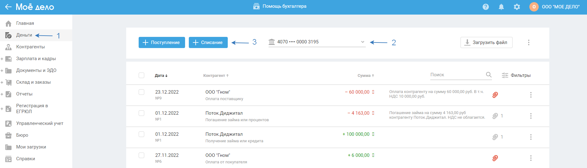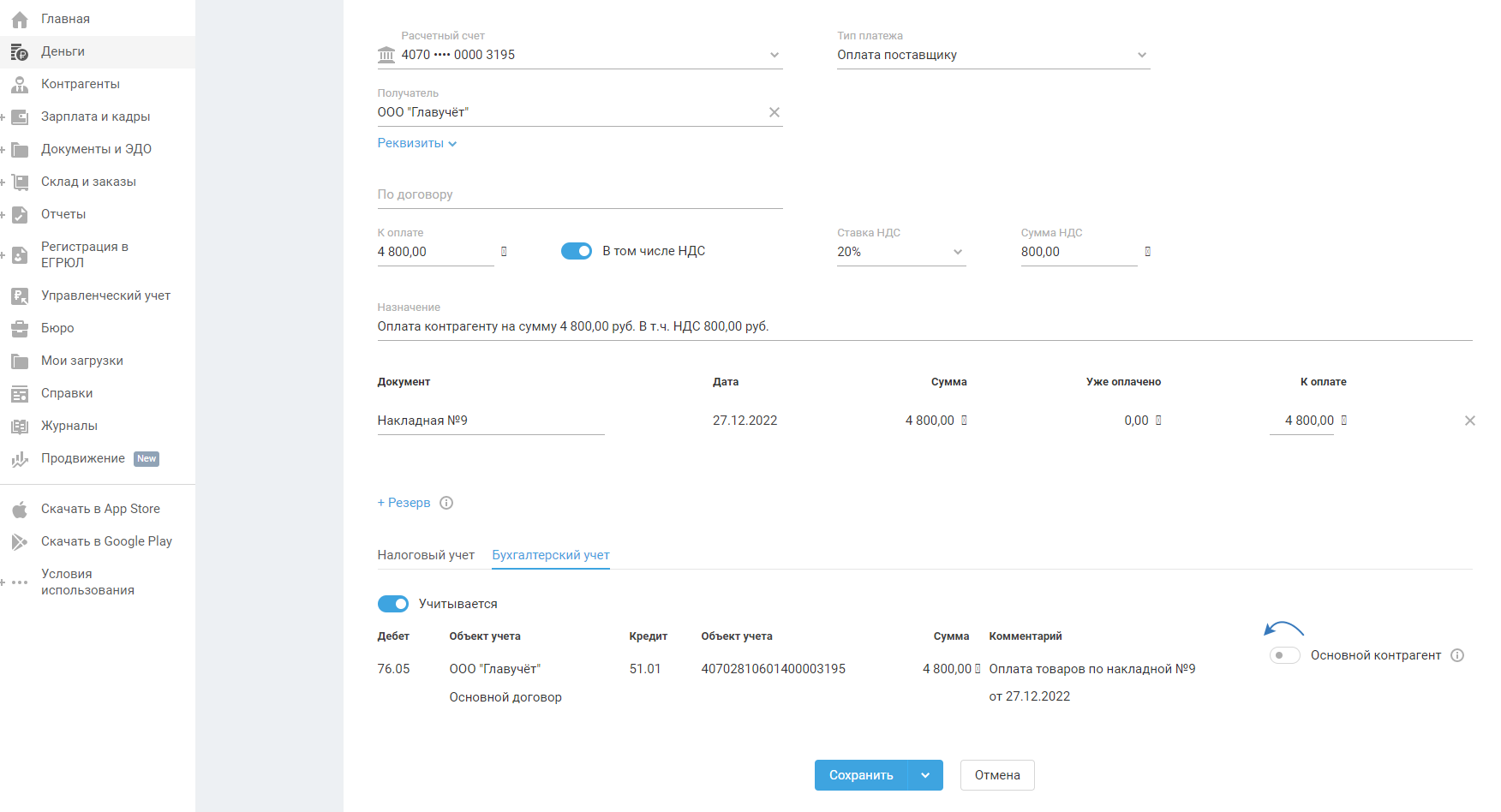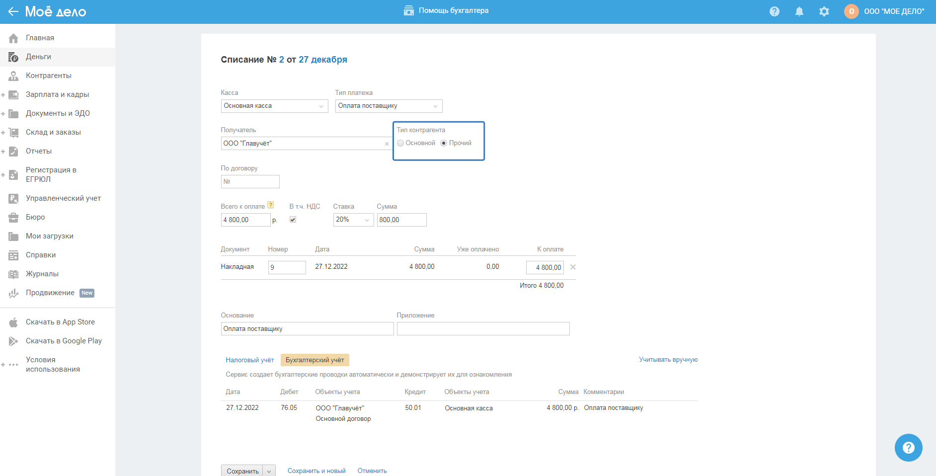 Если деньги перечисляются через Банк в разделе «Деньги» — «Банк» необходимо оформить Списание (исходящее платёжное поручение) с типом «Оплата поставщику». При этом в поле «Основной контрагент» необходимо переключатель передвинуть влево.