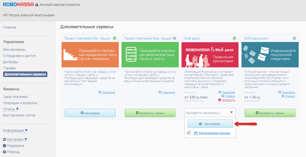 Интеграция подключается с двух сторон: из личного кабинета сервиса «Моё дело» и личного кабинета Робокассы.