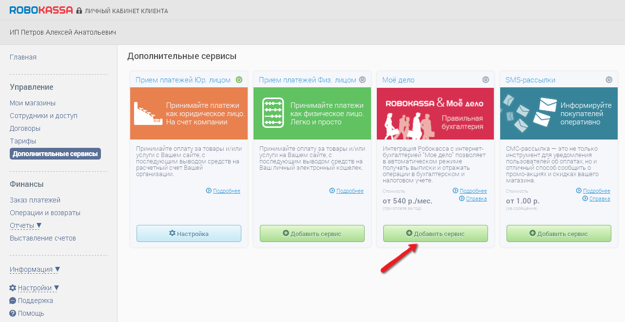 4. Включите использование сервиса «Моё дело». Для этого нажмите кнопку «Добавить сервис».