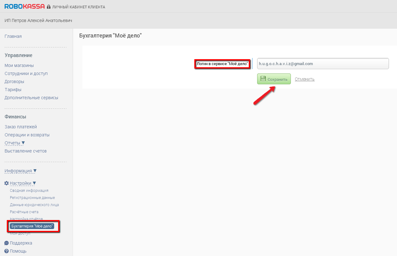7. Вы перейдёте в раздел личного кабинета «Настройки - Бухгалтерия "Моё дело"», где от вас необходимо указать ваш логин в сервисе «Моё дело» и нажать кнопку «Сохранить».
