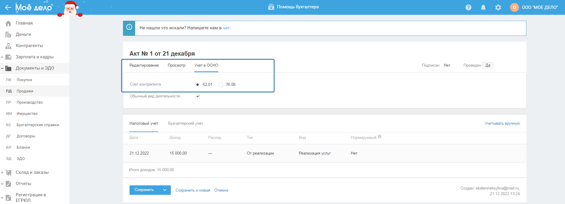 При реализации услуг, работ (товаров) на странице создаваемого акта (накладной) предлагается выбор одного из двух счетов бухгалтерского учёта, который будет отображаться в Дебете бухгалтерской проводки: