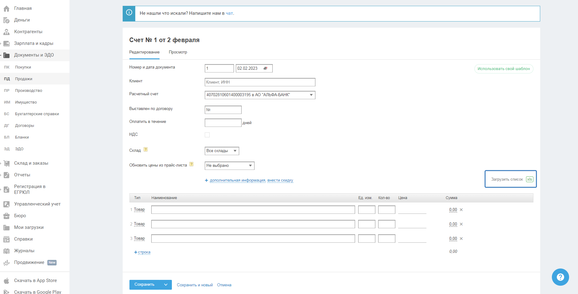 В сервисе представлена возможность загрузить (импортировать) список товаров из файла xls, при создании следующих документов: