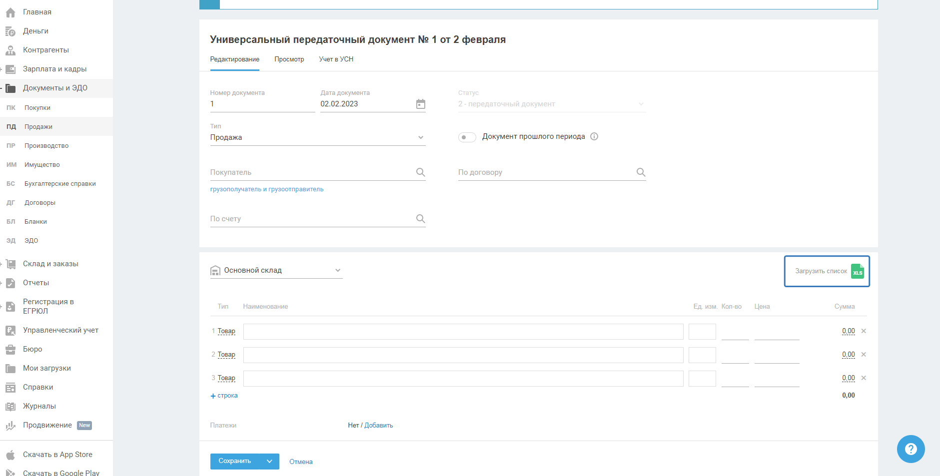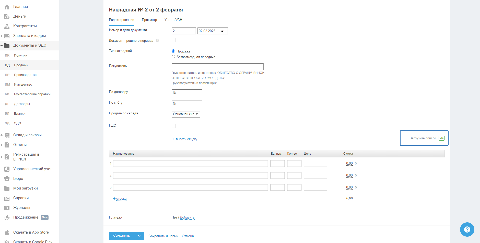 Загрузить список товаров из файла Вы можете при создании нового документа или при редактировании ранее созданного, для этого в режиме заполнения нажмите на кнопку «Загрузить список xls», находящуюся справа над таблицей с наименованиями товаров. Например,
