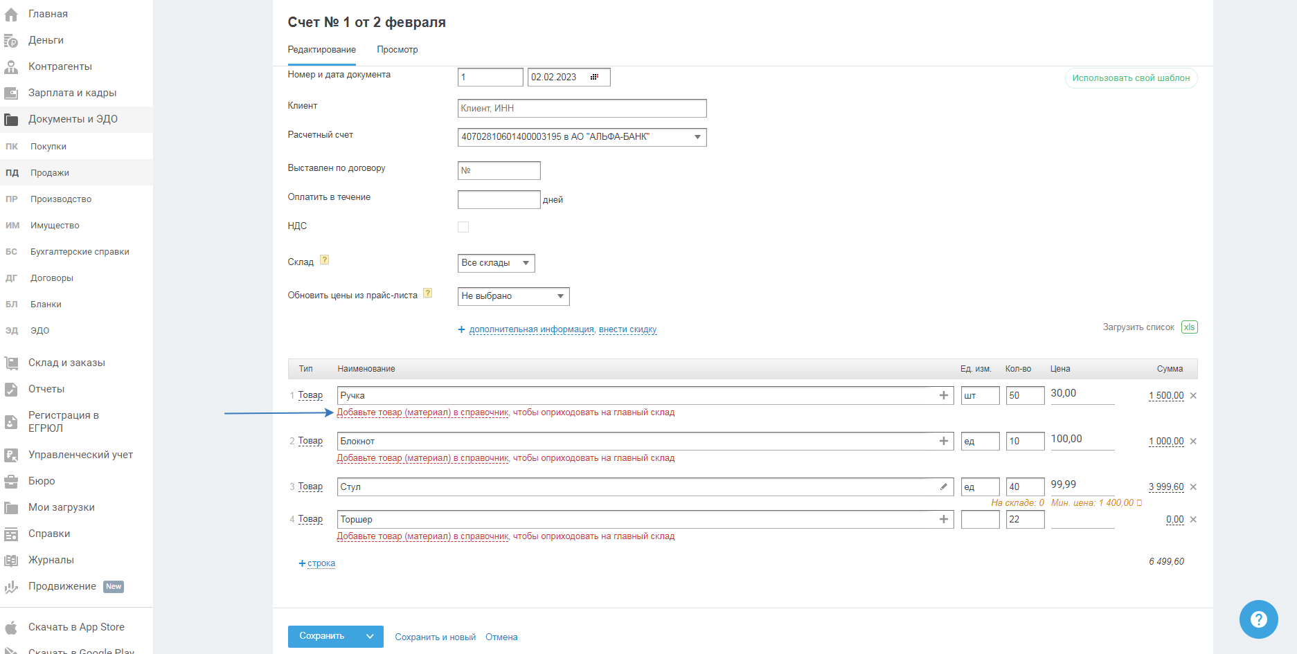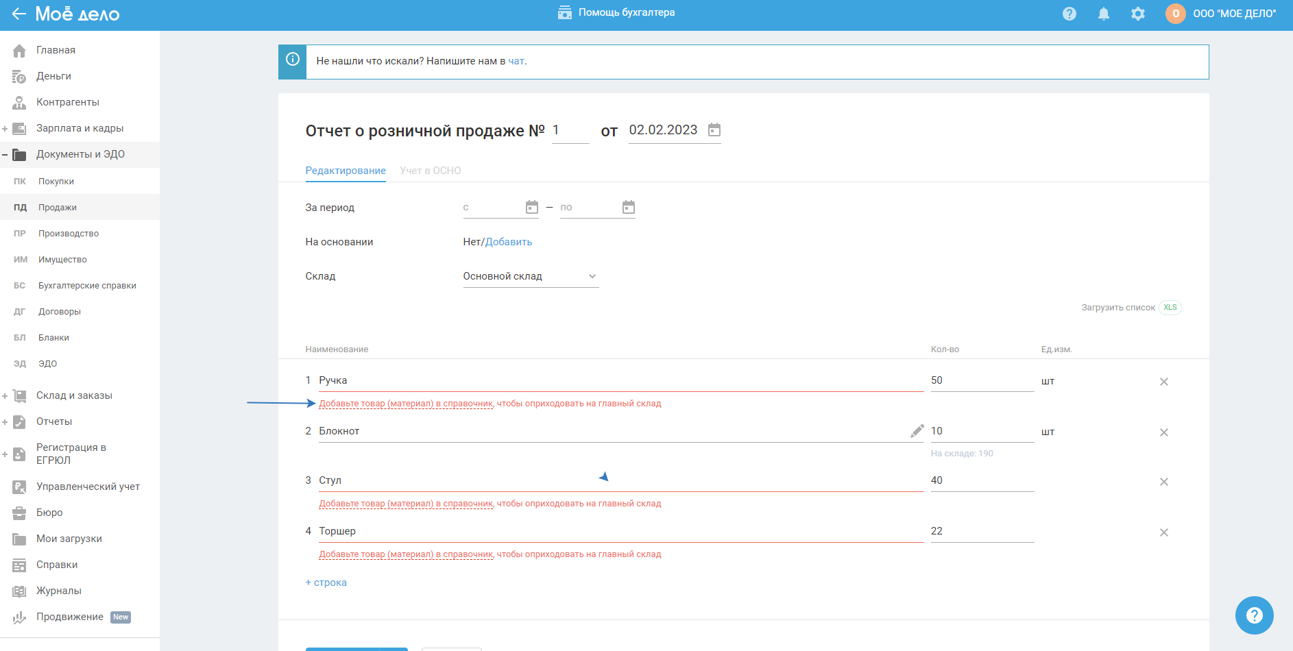 При загрузки данных из файла, сервис сравнивает их с уже имеющимися, на момент загрузки, номенклатурами товаров/материалов и если не находит совпадений, то предлагает добавить импортируемую номенклатуру в справочник — появляется сообщение «Добавьте товар (материал) в справочник, чтобы оприходовать на склад»: