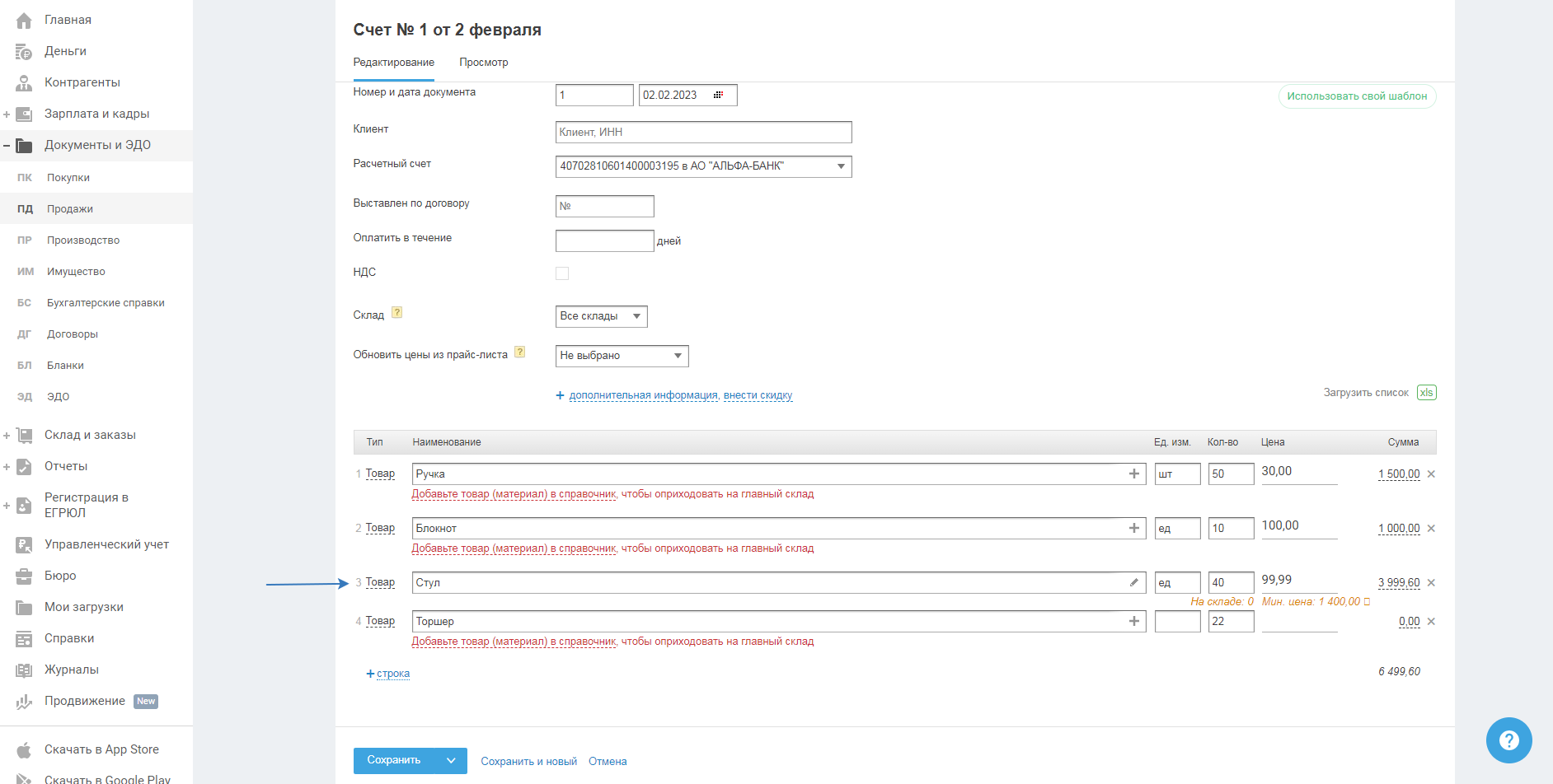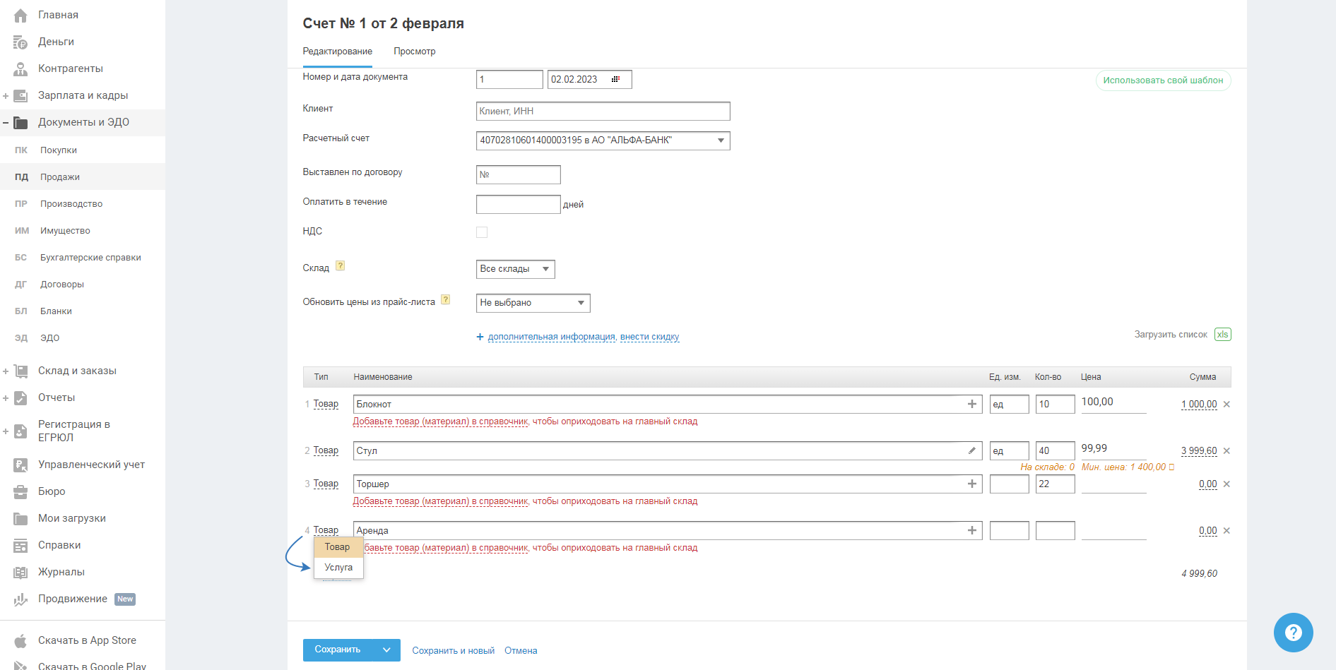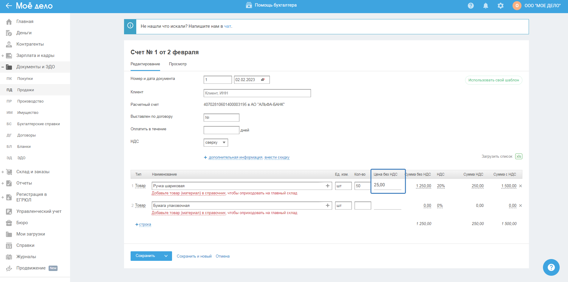 При создании счёта, накладной, УПД