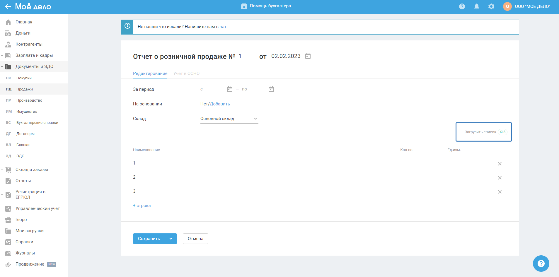 Вы можете загрузить список номенклатуры товаров / материалов в форму отчёта о розничной продаже, для это нажмите на поле «Загрузить список XLS»: