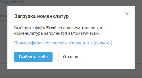 После этого откроется окно для выбора файла со списком товаров, в котором можно скачать пример файла: