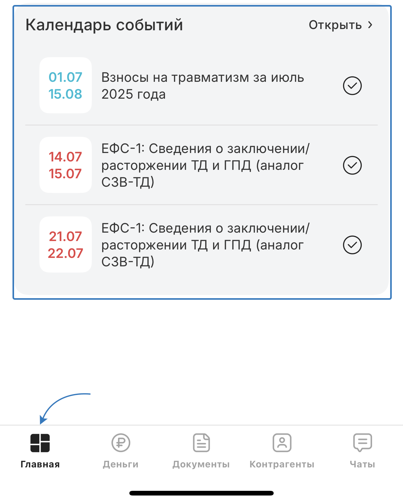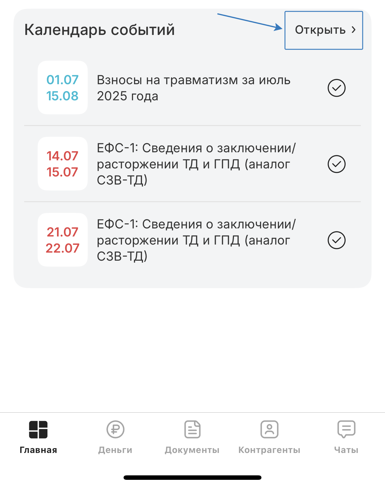 Нажав на главном экране в виджете «Календарь событий» на кнопку «Открыть», вы перейдёте на отдельную страницу по событиям налогового календаря: