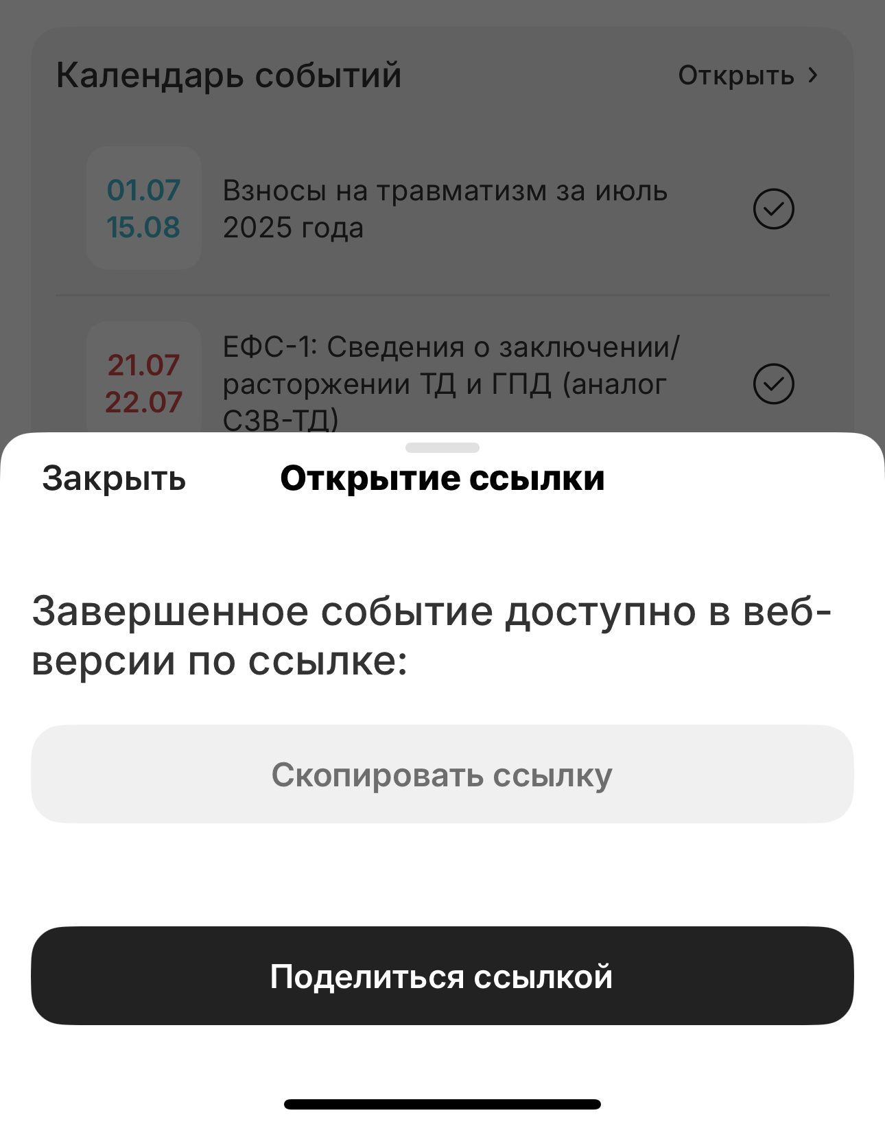 Прохождение некоторых событий доступно только в веб-версии. Нажимая на подобное событие откроется окно с возможностью «Скопировать ссылку» и «Поделиться ссылкой»: