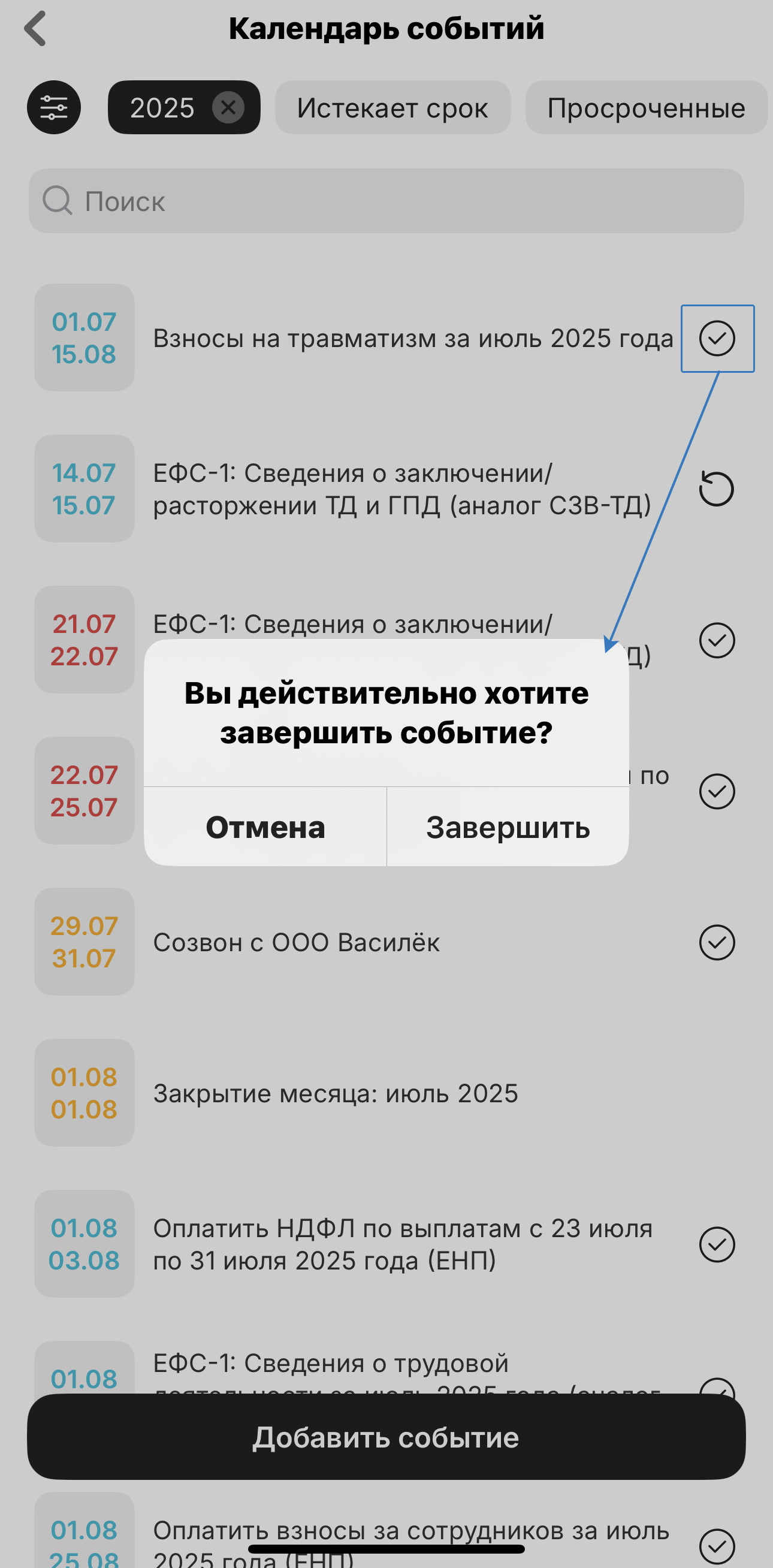 Напротив некоторых событий есть кнопка завершить в виде галочки, при клике на неё событие завершается, т.е. пропадает из списка актуальных дел и переносится в завершённые: