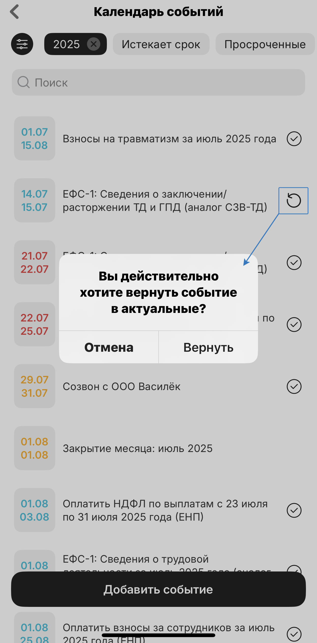 Завершённые события можно вернуть в актуальные, нажав на кнопку возврата в виде круглой стрелки:
