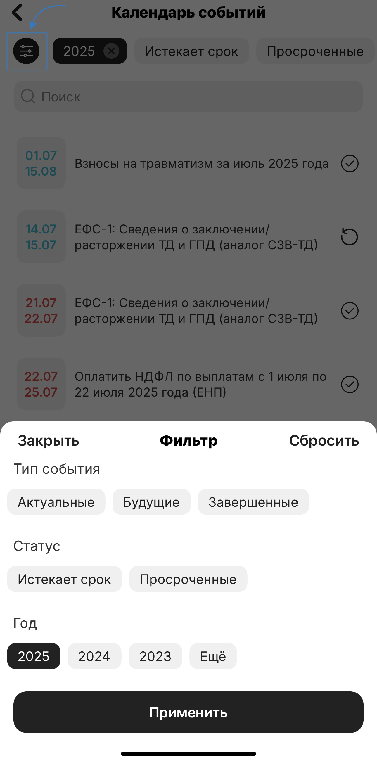 Укажите параметры (типа события, статус, год), нажмите «Применить».