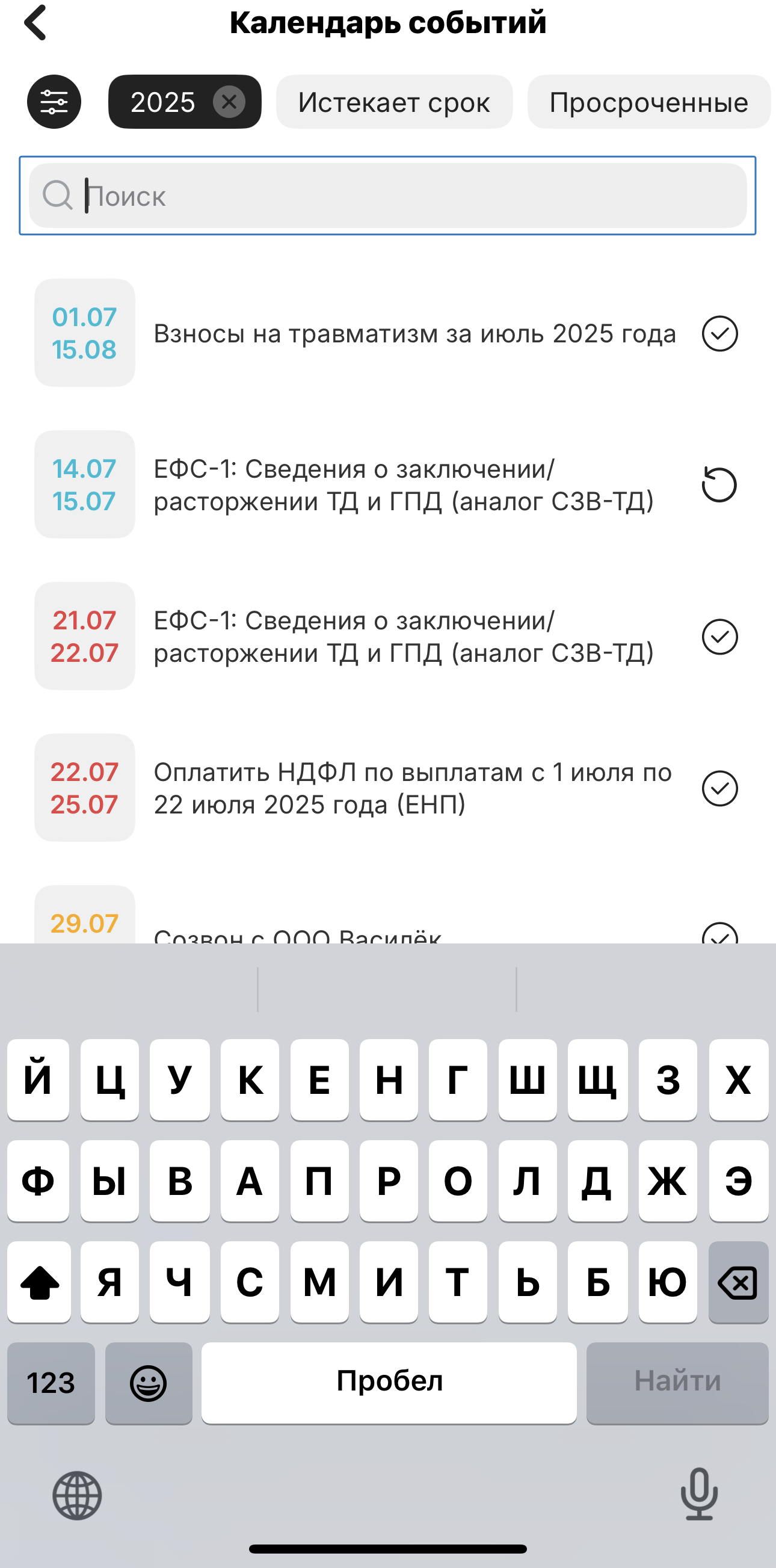 Для поиска события нажмите на строку «Поиск» или лупу. Поле станет активным, и откроется клавиатура для ввода запроса: