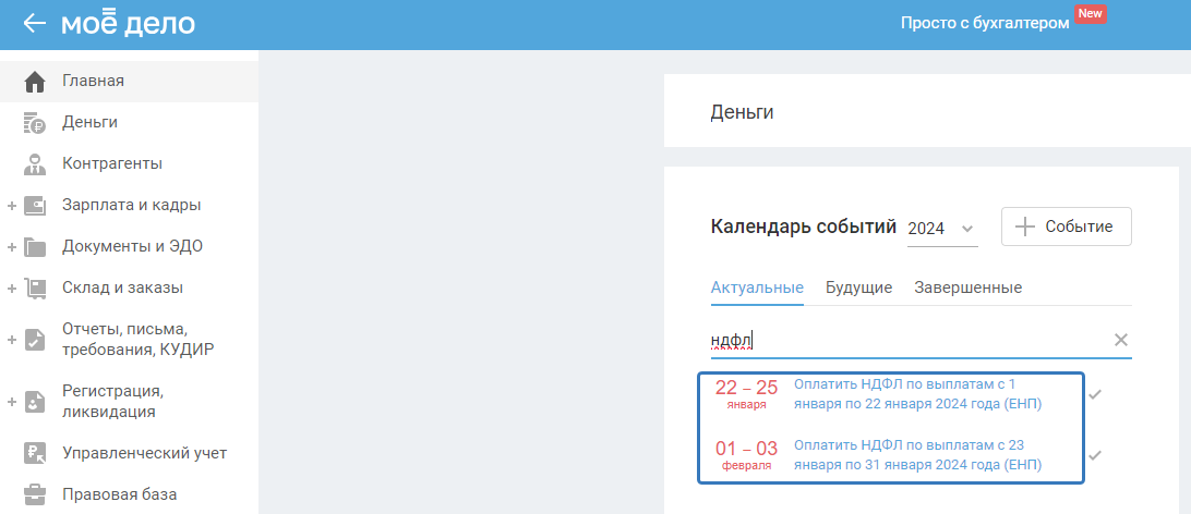 Важно. Платёжное поручение на уплату НДФЛ формируется в Календаре событий: