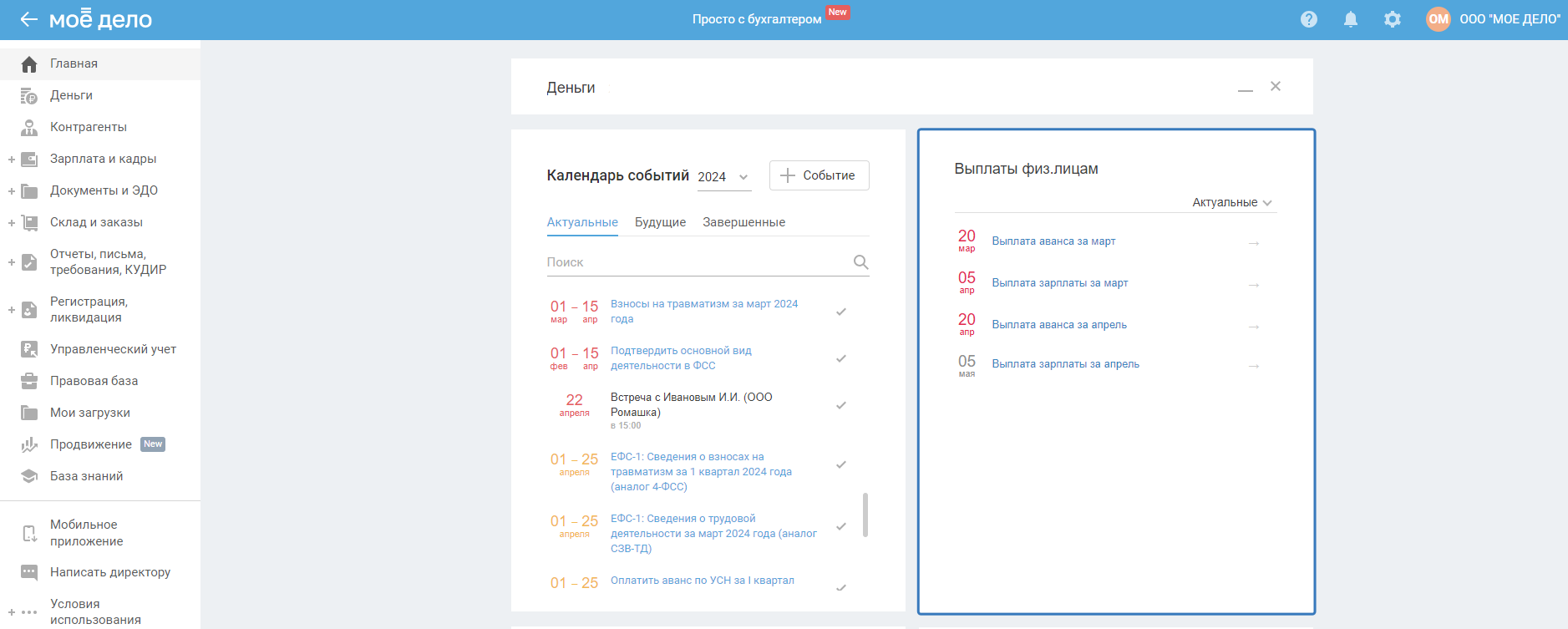 На Главной странице на тарифах для ИП с сотрудниками и для организаций рядом с Календарём событий размещён календарь «Выплаты физ.лицам»: