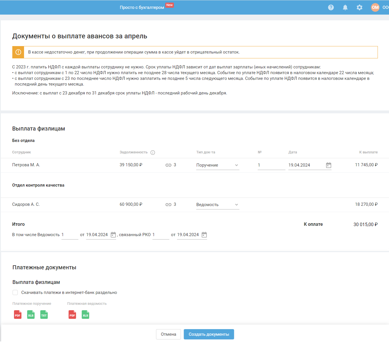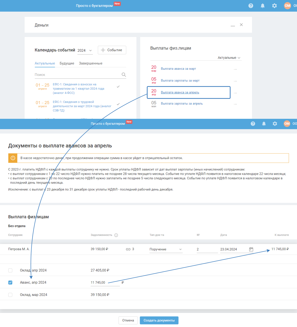 Или, если в событии сотруднику выплачивается начисление по ведомости или ордеру, то скачайте данные документы, а для завершения события нажмите «Создать документы», тогда операции отразятся в разделе «Деньги».