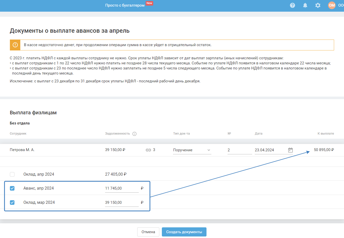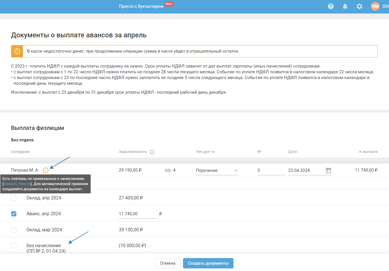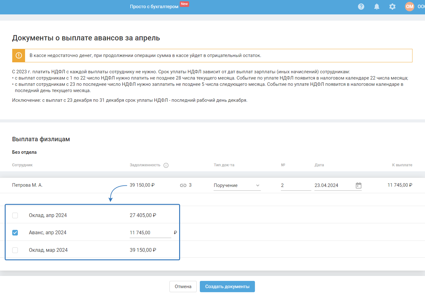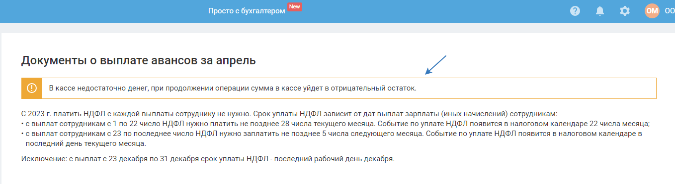 При выплате зарплаты и других начислений из кассы, если остатка в кассе не хватает для списания нужной суммы, то вы увидите уведомление «В кассе недостаточно денег, при продолжении операции сумма в кассе уйдёт в отрицательный остаток»: