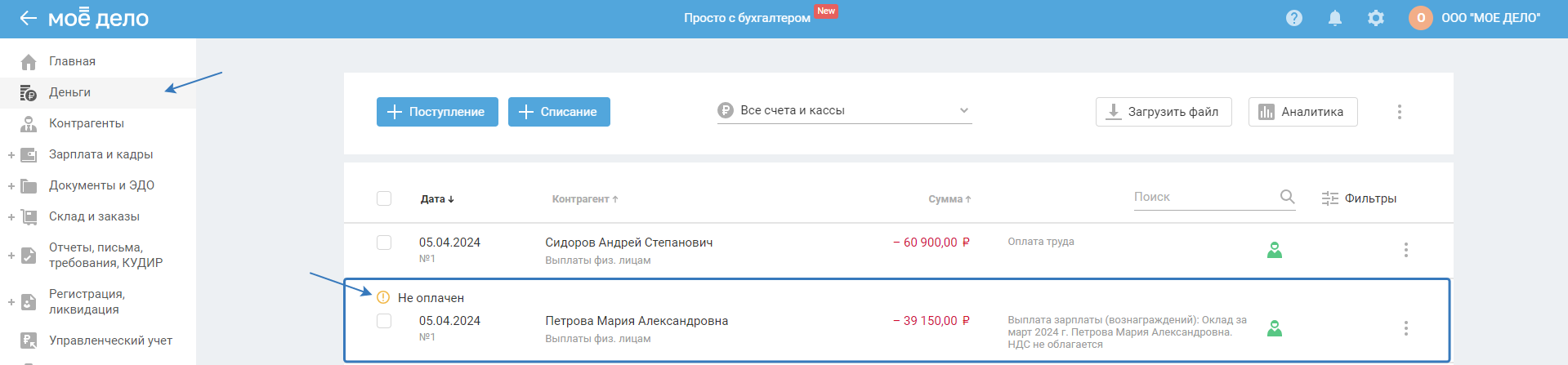 Если интеграция не настроена, то вы можете скачать платёжные поручения в удобном для вас формате, например, в формате для интернет-банка и загрузить далее в банк. Далее нажмите «Создать документы», тогда операции отразятся в разделе «Деньги» со статусом «Не оплачено».