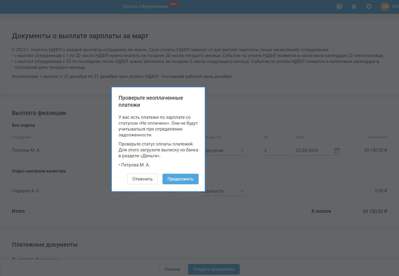 В календаре выплат при переходе в событие выплаты зарплаты появляется модальное окно при условии, что за месяц, за который выплачивается зарплата, есть привязанная выплата в разделе «Деньги» со статусом «Не оплачено»: