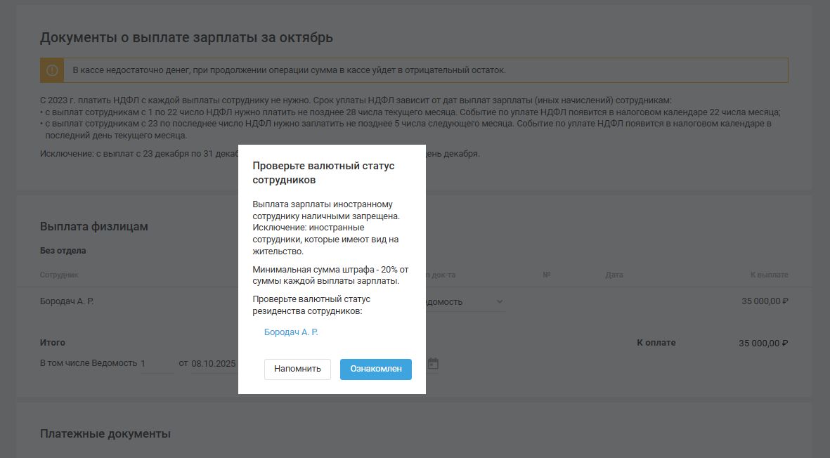 В календаре выплат при переходе в событие выплаты зарплаты появляется модальное окно при условии, что иностранному сотруднику, кроме постоянно проживающих, установлен способ выплаты «По ведомости» или «По кассовому ордеру»: