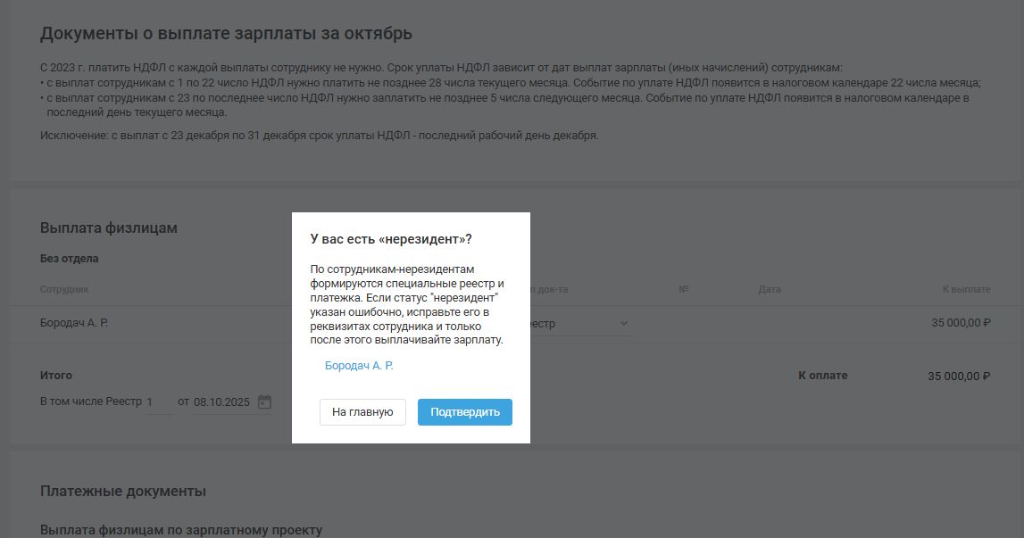 В календаре выплат при переходе в событие выплаты зарплаты появляется модальное окно при условии, что есть сотрудники — нерезиденты, которым установлен способ выплаты «По зарплатному проекту»: