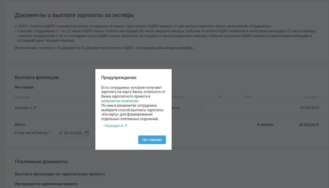 В календаре выплат при переходе в событие выплаты зарплаты появляется модальное окно при условии, что есть сотрудники, которые получают заработную плату на карту банка, отличного от банка зарплатного проекта в реквизитах компании: