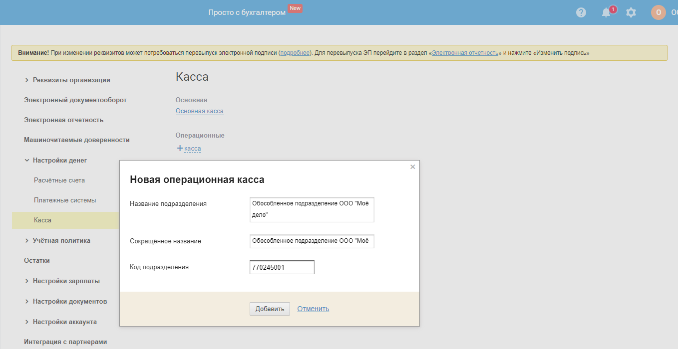 При добавлении кассы ООО обычно указываются данные обособленного подразделения. В поле Название подразделения указывается наименование обособленного подразделения. В поле Код подразделения — КПП из уведомления ФНС.